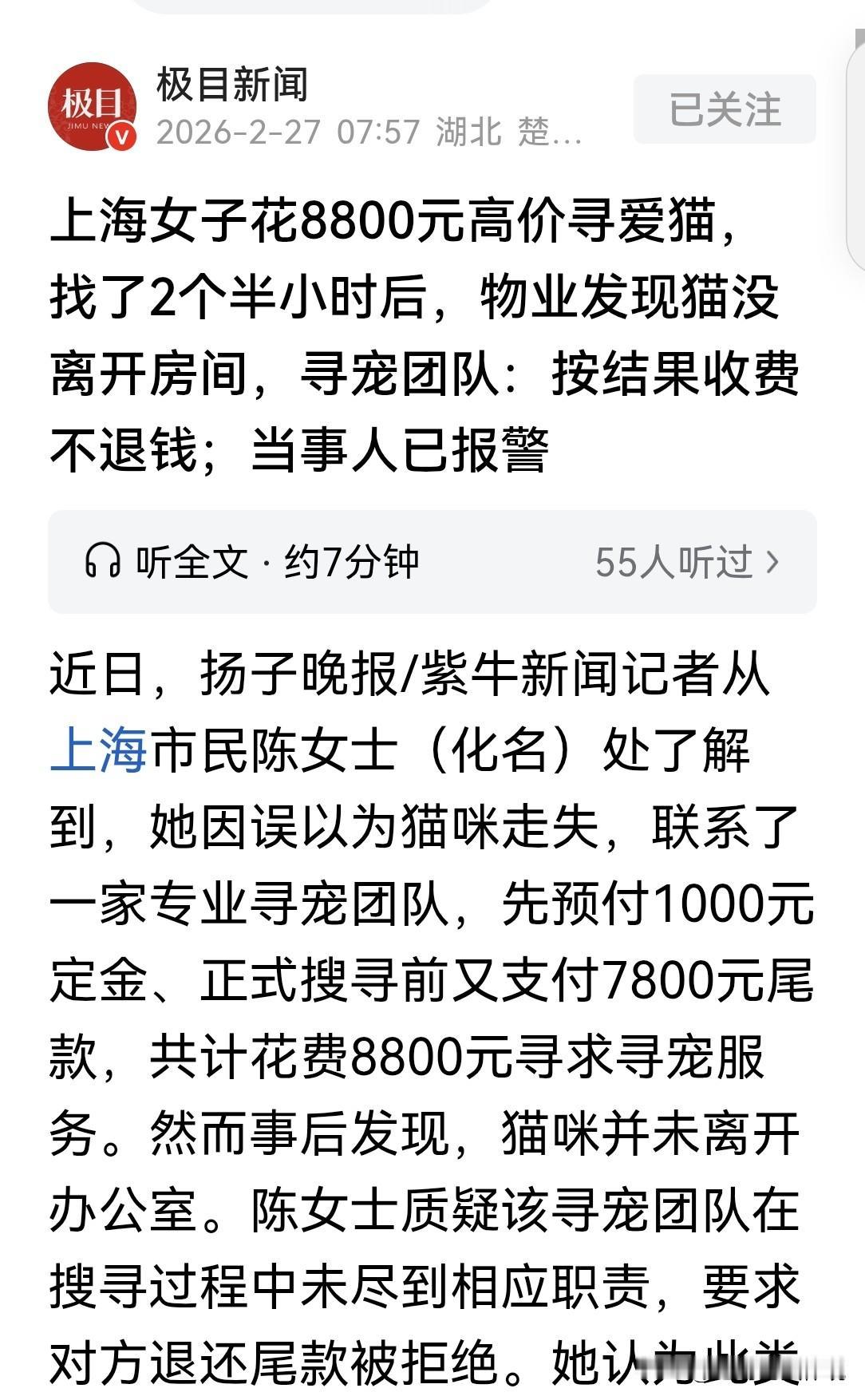 上海,女子将爱猫带到办公室玩耍,猫咪突然走失,她联系了寻宠团队,选择了8800元的单犬双人套餐,并支付了1000元定金,搜寻人员正式搜寻前,她又按对方要求,将7800元尾款全额交齐。谁知,2小时后,在办公室的桌下发现猫咪,女子提出退还7800元尾款,1000元定金作为人工费支付, 可对方一分钱也不退,女子气的报警。 2月21日,陈女士带着爱猫去朋友的办公室玩耍。 猫咪在房间里好奇地跑来跑去,陈女士和朋友在一旁聊天。 陈女士突然发现猫咪不见了踪影,再一看,办公室的窗户开着。 她的心一下子揪紧了,以为猫咪从窗户跳出去走失了。 从当晚7点开始,陈女士心急如焚地在办公室附近四处搜寻。 她沿着街道、草丛寻找,一边找,一边轻声呼唤着猫咪的名字。 时间一分一秒地过去,直到凌晨1点,她依然一无所获。 那一夜,陈女士几乎没合眼,又担忧又焦虑。 第二天早上6点多,陈女士联系了一家寻宠团队。 双方添加微信后,寻宠团队迅速给出了多款寻宠方案。 报价从8800元,到48000元不等。 陈女士觉得可以接受,她选择了8800元的单犬双人套餐。 对方发过来合同,陈女士顾不上仔细看,就先支付了1000元定金。 在正式搜寻前,对方又要求陈女士将7800元尾款交了,不然就不出发去找。 陈女士没犹豫,就把7800转了过去。 寻宠团队开始在办公区域及周边搜寻。 陈女士跟在团队后面,她渐渐发现事情有些不对劲。 整个搜寻过程持续了两个半小时,可寻宠团队的人,似乎并没有付出太多有效的努力。 其中一人自称刚入行没多久,手忙脚乱的; 他们连监控都没查看,另一位带着狗的人,就像在小区里闲逛一样,对周围的环境似乎并不上心。 更让陈女士生气的是,犬只在小区里排便后,工作人员竟然不知道及时清理。 两个多小时后,就在陈女士对寻宠团队越来越失望的时候。 物业工作人员在办公室发现,猫咪竟然一直躲在桌子下面,根本没离开过房间。 陈女士联系寻宠团队,提出因为猫咪并不是他们找到的,希望退还那7800元尾款。 只将1000元定金,作为人工费支付。 然而,她的要求遭到了对方的坚决拒绝。 寻宠团队的工作人员理直气壮地表示,他们是按结果收费。 不管猫咪是谁找到的,只要找到了,这8800元就不能退。 陈女士后续再联系该团队,客服竟然拒接她的电话。 陈女士又委屈又愤怒,她觉得自己不仅花了冤枉钱,还被寻宠团队敷衍对待。 而且他们没有尽到应有的职责,合同也存在很多模糊之处。 对于“找到宠物”的界定,合同里写得含糊不清。 按照合同条款,不管是任何时间、任何地点、任何人找到宠物,寻宠团队都要按结果收费。 此外,合同中还规定,陈女士在委托该团队后,不得再委托第三方寻找宠物,这让她觉得自己完全陷入了被动。 越想越气的陈女士随即选择了报警。 在警方的建议下,她在支付平台,对付款订单进行了举报,要求冻结款项。 同时,她也委托了律师,开始收集证据,准备通过法律途径维护自己的权益。 有记者联系了涉事的寻宠团队。 接线的工作人员表示,知晓陈女士反映的这事。 但因为不是自己经手的订单,所以不清楚具体情况,会联系经手的同事。 截至记者发稿前,该工作人员称团队正在与陈女士进行沟通。 针对陈女士的遭遇,有法律界人士认为,虽然合同约定,猫咪在家里找到也算完成工作。 但关键在于寻宠团队,是不是在家里寻找了。 也就是说,如果寻宠团队,根本没仔细寻问,也没在办公室里寻找。 那么猫咪的发现,与他们没什么关系,他们妄图坐享其成的行为,就构成违约。 陈女士有权要求退还尾款。 有人认为,这就好比忘了带钥匙出门,找开锁师傅,先收了开锁费,师傅在开锁过程中,客户找到了钥匙。 实际上属于客户自行要求中止服务,但事实上师傅已经完成了第一步的上门。 而第二步开锁未完成,是客户造成的,师傅已经在使用所学技能展开工作,所以收取全款没有问题。 根据《民法典》第497条规定:提供格式条款一方不合理地免除或者减轻其责任、加重对方责任、限制对方主要权利、排除对方主要权利的,该格式条款无效。 寻宠团队提供的合同中,不管任何时间、任何地点、任何人找到宠物,都要按结果收费的条款。 属于典型的不合理、免除自身责任的格式条款。 这意味着,无论寻宠团队是否付出了实际劳动、是否履行了合同义务。 只要宠物被找到,他们就收取全部费用,这显然不合理地免除了他们应尽的搜寻义务。 排除了宠物主人要求按服务实际履行情况,支付费用的主要权利。 另外,合同中规定,陈女士在委托该团队后不得再委托第三方寻找宠物。 这也在一定程度上限制了陈女士的权利。 而寻宠团队,却未因此承担更多义务。 这属于加重对方责任、限制对方主要权利的条款。 这些条款应被认定为无效的格式条款。 对此你怎么看?