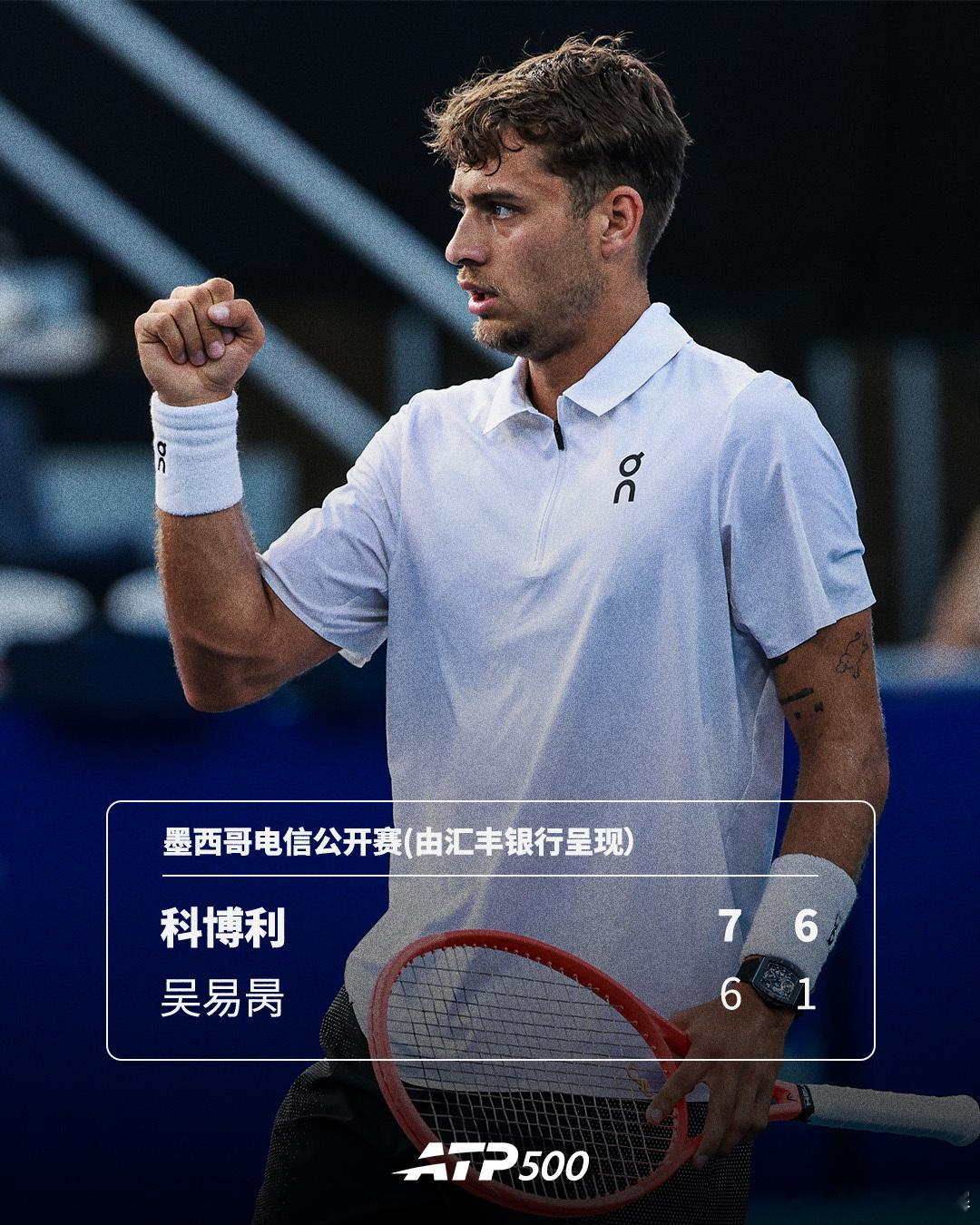 ATP500 墨西哥电信公开赛(由汇丰银行呈现)1/4决赛,吴易昺首盘错失两个盘点,全场8个破发点均未能把握住,以6-7(4) 1-6不敌5号种子科博利,无缘晋级四强。科博利则连续两周闯进半决赛,静候阿特玛纳与凯茨玛诺维奇的胜者。