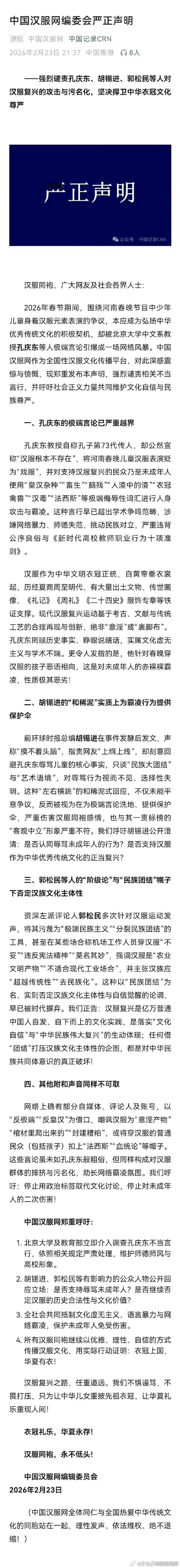 其实就一句话,不能把汉服简单当成封建糟粕来全盘否定。现在只是人们喜欢自发穿。国家也没有干涉,更不会强制所有人必须穿。某些人把汉服和皇汉直接画等号,就是不调查了解随意开炮。这也不符合教员的思路和他倡导的方式吧。喜欢汉服穿汉服只是对中华传统文明的认可,这难道也不可以吗?老登真的不分左右,老登最大的问题就是对自己不理解的事物一棍子打死。可以不喜欢汉服但没必要把汉服当成什么大逆不道的东西来看。我认为汉服的现状积极性更大。