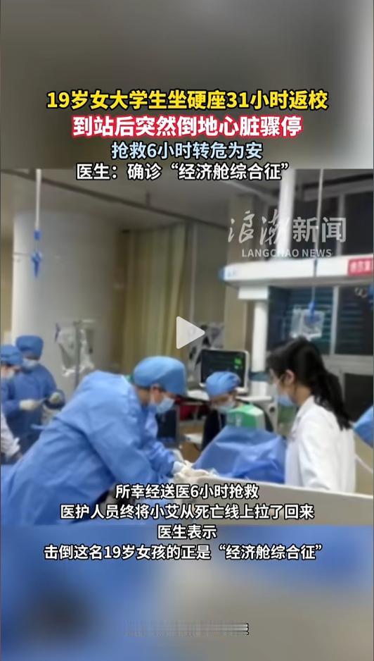 “万万没想到!”近日,广东东莞,一女子坐了31小时硬座,下车后走了没几步,突然间失去意识,摔倒在站台上。女子被紧急送医后,被确诊为“经济舱综合征”,足足抢救了六个小时,才脱离危险,捡回了一条命。网友:穷也是一种病? 据媒体2月26日报道,小艾今年19岁,是一名大一学生。她从成都出发,坐了近31小时的硬座。没想到下车后刚走几步,她就出现了心脏骤停的情况,意识消失摔倒在了地上。周围人紧急把她送往了医院。 经过医生六个小时的不懈努力,小艾终于脱离了危险。医生介绍,她这时患上了“经济舱综合征”。这是一系列病症的俗称,主要原因是久坐导致腿上形成了血栓,里面最危险的症状就是肺栓塞,可能导致猝死。 据悉,小艾在出发之前,身体就不太舒服,已经胸闷了两天。再加上坐了长时间的硬座,身体变得十分疲累,两下一叠加,这才导致了她出现了心脏骤停。 网友看后表示,经不经济舱的无所谓,关键的是得注意调节,平时得多锻炼身体。久站久坐、作息紊乱等不良生活习惯都会导致很多健康问题,我们要尽可能的避免。 在乘坐车辆进行长途旅行时,不要一直坐在那里,每个把小时起身活动活动,看看远方,补充补充水分,能让旅途变得更舒适,也能降低发生“经济舱综合征”的风险。 信息来源:《19岁女大学生坐硬座31小时返校,到站后突然倒地心脏骤停,医生:确诊“经济舱综合征”》浪潮新闻