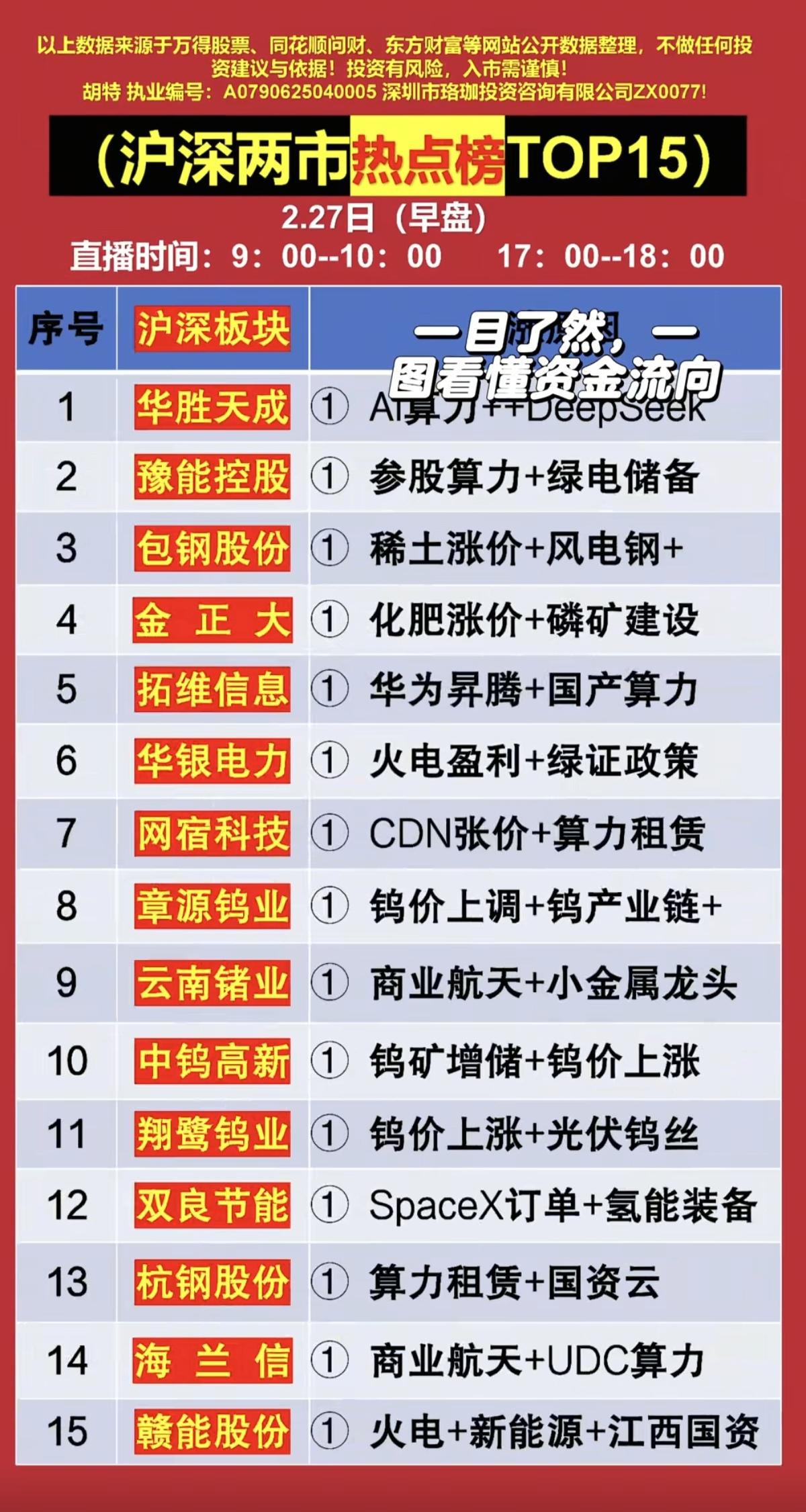 2.27周五 主力大资金抢筹+人气榜! 资金抢筹焦点: 1.稀土涨价+风电钢 2.华为昇腾+国产算力 3.商业航天+小金属 4.钨矿,涨价 5.火电、新能源