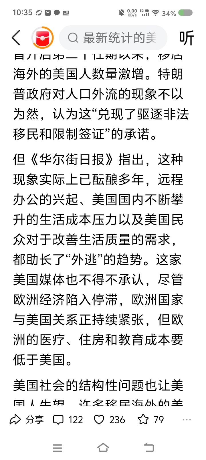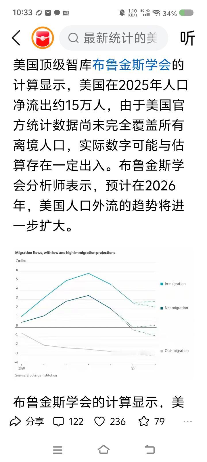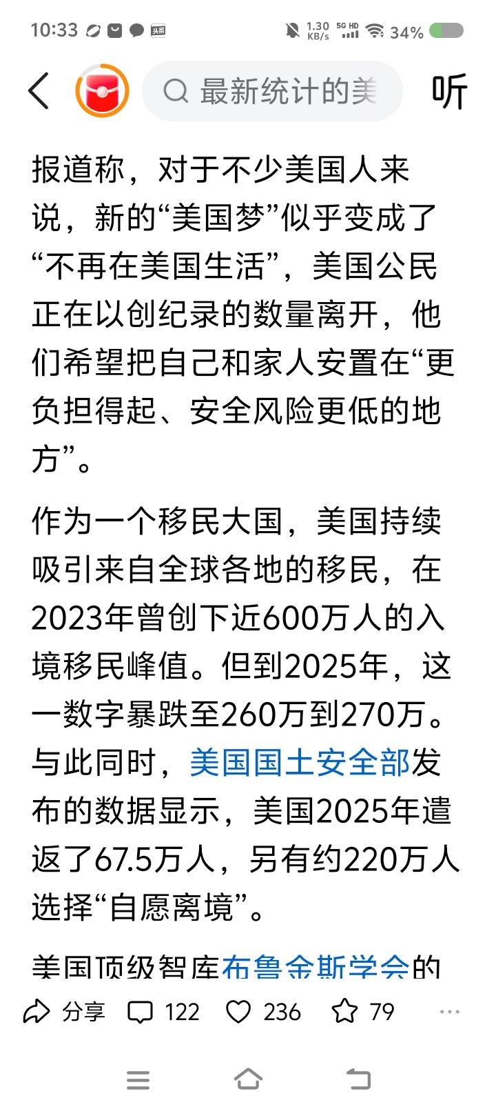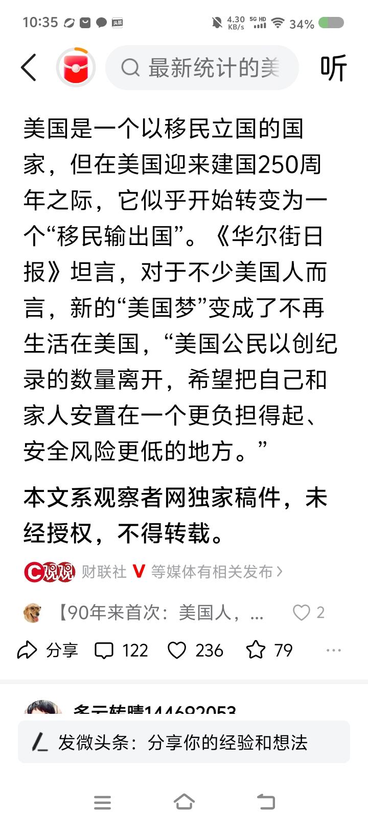 美国成为人口流失国?—— 据报道,2025年,美国人口流出数量高于流进数量。2023年,美国入境移民600万,2025年跌至270万左右。另外,美国遣返了67.5万人。欧洲成为美国离境人口的普遍选择。普通人比例增大。 点评: 原因大概有两个:一是美国的实力与吸引力下滑。二是特朗普的恐怖政策。 同样,评论区还是有人问:为什么美国驻华使馆前排队的人那么多? 你看,没劲了吧。 我没说美国不好。美国欢迎你!中国出入自由。 同样,日本也一样。日本欢迎你!中国出入自由。 但是,有个问题:出去了别给中国丢人。即使你移民了,干了丢人的事,还是有人把你当成原来国家的人。或者,你被歧视了,那个时候,你别哭着喊着找中国驻外大使馆,或者网上撒泼,找同情。 网上视频:在美国,两个中国人模样的人在街上吵架,用中文。好像一个人的车妨碍了对方,对方不依不饶。这个人说:“给你挪开不就完了吗?至于么?都是中国人,不能好好说话么?”另一个人立马更激动了:“谁是中国人?我是美国人!你是中国人,来这干什么?”对方说:“我也是美国人……” 全程中文! 如果他们都是美国人,那可太逗了!太惊悚了! 两个移民美国的华人,用中文吵架,以自己被当作中国人为耻,又把原先中国人的不好的一面向全世界展现了! 这种人,活什么劲?! 移民出去的,也有对中国友好的;中国人里,也有畜牲。移民不是考验一个人爱国与否的因素。但无论你是哪国人,都首先做一个堂堂正正的人,无愧天地良心的人,做个有人性有人味的人。 结论:无论中国人,还是美国人、日本人,还是什么地方的人,都把自己的“国”与“家”建设好,无论你在哪里。