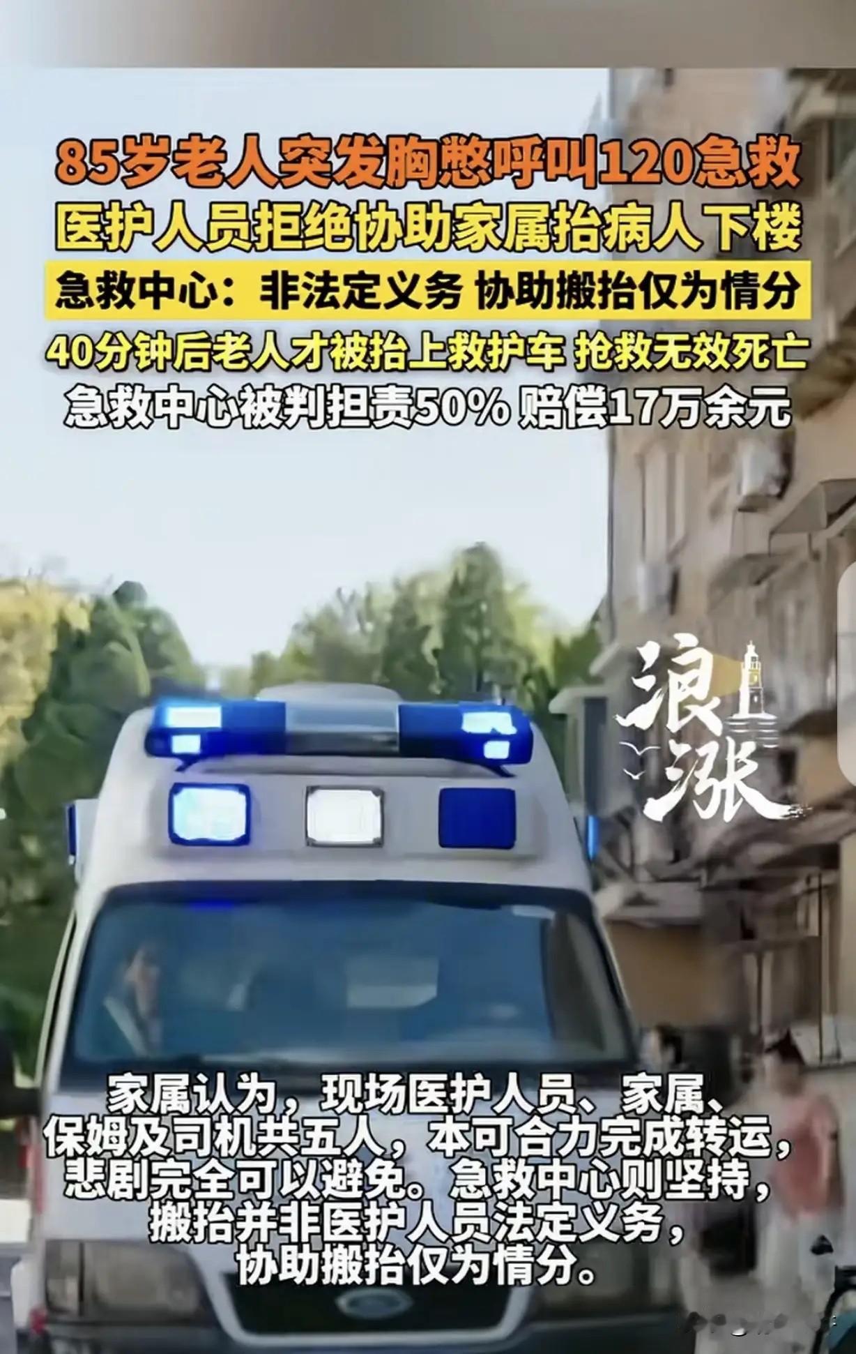 山西阳泉,一85岁老人发病,虽然离医院就4分钟的路,但家人怕耽误病情还是叫了120,不料,医护人员拒绝帮家属把老人抬下5楼。导致老人40分钟才上救护车,老人因耽误了抢救,不幸离世,而急救中心却说:我们没义务帮着抬人,帮是情分,不帮是本分。家属愤怒的起诉到法院,一审:急救中心承担50 %责任,赔偿家属17万,急救中心上诉,二审判决出乎意料。 2024年6月9日深夜,85岁的陈女士在老式居民楼的五楼突然胸憋难忍,呼吸越来越急促。 儿子王先生和保姆守在身边,看着老人痛苦的样子,手都在抖。这栋楼是步梯房,没有电梯,王先生知道自己一个人根本没法把老人安全抬下楼,不敢耽误半秒,立刻拨通了120。 救护车来得很快,从小区门口到医院不过4分钟车程,可谁也没想到,急救人员到场后,事情的走向彻底偏离了预期。 医生、护士和司机三人站在楼道里,听完王先生的求助,直接摇了头。他们说,搬抬病人不是医护人员的法定义务,只是情分,让王先生自己找人帮忙,或者联系110求助。 王先生急得直跺脚,他反复哀求,说老人情况危急,再耽误下去后果不堪设想,甚至在电话里承诺给赶来帮忙的亲友酬谢,可急救人员始终不为所动。他们站在原地,看着老人的呼吸越来越微弱,却没有上前搭把手的意思。 无奈之下,王先生只能给远在外地的妹妹冯女士打电话,又联系了住在附近的亲友,让他们赶紧过来帮忙。等待的每一分钟都像一个世纪那么漫长,楼道里的空气仿佛凝固了,只有老人粗重的喘息声和王先生的心跳声。 四十分钟后,亲友终于赶到,而此时的陈女士已经脸色发紫,失去了意识。 直到这时,急救人员才上前,和家属、保姆一起把老人抬下了楼。救护车一路疾驰到医院,可一切都晚了,老人送到时已经没有了自主呼吸,经过全力抢救,还是没能挽回生命。 老人的离世像一把刀,扎在了每个家人的心上。 他们想不通,明明离医院那么近,明明有急救人员在场,为什么会是这样的结果。冯女士从外地赶回来,抱着母亲的遗像,眼泪流干了,只剩下满心的愤怒和不甘。 他们找到急救中心讨说法,得到的回应还是那套说辞:搬抬不是法定义务,帮是情分,不帮是本分。急救中心还说,调度员在电话里已经提醒过家属,需要自行找人抬人,他们已经尽到了告知义务。 这样的解释让家属彻底寒了心。他们认为,现场明明有五个人——两名家属、保姆、医生、司机,完全有能力合力完成转运,急救人员的推诿和冷漠,直接导致了抢救时机的延误,才让悲剧发生。 于是,家属将急救中心告上了法庭。一审庭审中,双方的争议焦点始终围绕着“搬抬是否属于法定义务”展开。急救中心的律师反复强调,相关法律法规中并没有明确规定医护人员必须协助搬抬病人,他们的行为符合行业规范,不存在过错。 而家属的律师则指出,急救人员的职责不仅是提供医疗救治,更包括在紧急情况下保障患者的转运安全。 在患者生命垂危、家属无力搬抬的情况下,急救人员以“无义务”为由拒绝协助,明显违背了救死扶伤的职业宗旨,也背离了公众对急救服务的期待。 一审法院经过审理,最终认定急救中心在转运过程中存在过错,判决其承担50%的责任,赔偿家属17万余元。 法院认为,急救人员在明知患者病情危急、家属无力搬抬的情况下,未采取有效措施协助转运,导致抢救时机延误,与老人的离世存在因果关系。 急救中心对一审判决不服,提起了上诉。他们坚持自己的观点,认为法院的判决过于严苛,忽视了行业的实际困难。而冯女士也对一审的责任比例提出了质疑,她认为,即便不考虑搬抬问题,医方在监护、用药和心肺复苏操作上也存在不规范之处,应该承担更多的责任。 2025年11月17日,二审开庭审理。法庭上,双方再次展开了激烈的辩论。急救中心的律师强调,医护人员的核心职责是医疗救治,搬抬属于体力劳动,不应由他们承担,而且他们已经在老人病情恶化后协助了转运,不存在故意延误。 冯女士则拿出了司法鉴定报告,指出医方在急救过程中存在多处违规,比如未对老人进行持续监护、用药不规范、心肺复苏操作不标准等。她认为,这些问题与搬抬延误叠加,共同导致了母亲的离世,急救中心的责任远不止50%。 经过审理,二审法院最终作出了判决:维持原判。法院认为,一审判决认定事实清楚,适用法律正确,急救中心的上诉理由不能成立,冯女士的上诉请求也缺乏充分的证据支持。 判决生效后,家属却迟迟没有收到急救中心的赔偿款。冯女士多次联系急救中心,对方总是以各种理由推脱。无奈之下,她向媒体反映了情况,希望借助舆论的力量推动赔偿落实。 很快,这件事引起了广泛关注。官方也对市急救中心进行了严肃约谈,要求其尽快履行赔偿义务,给家属一个交代。冯女士表示,如果急救中心仍然拒不履行,她将向法院申请强制执行,直到拿到应有的赔偿。 各位读者你们怎么看?欢迎在评论区讨论。