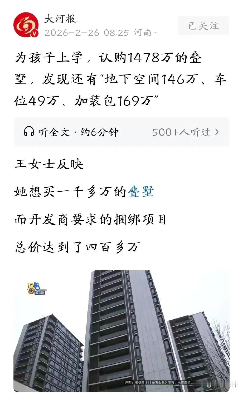 吃相太难看!浙江杭州,女子为了孩子上学,花1478万买了套叠墅,谁知,付了5万块定金之后,销售竟然告诉她,想要办贷款,还要额外购买146万的地下室,两个49万的车位,还有169万的加装包,杂七杂八要400多万。女子顿时懵了,她用不上这些,便干脆不办贷款,准备全款买房,没想到,竟遭到开发商拒绝。更绝的是,开发商还直接将她告上法庭,要没收她5万定金。 王女士和丈夫在杭州打拼了十几年,从出租屋到小公寓,再到现在能拿出千万预算买房,每一步都走得不容易。 他们看中这套叠墅,最核心的原因就是它对口的公办学校,师资和升学率在区里数一数二,为了让孩子能进这所学校,夫妻俩咬咬牙,把这些年的积蓄都拿了出来,还做好了贷款的打算。 付定金那天,销售带着他们看了样板间,把叠墅的户型、采光、学区优势说得天花乱坠,全程没提过地下室、车位和加装包的事。 王女士问得很细,从首付比例到贷款年限,从交房时间到产权年限,销售都一一回应,唯独对这些附加费用绝口不提。她想着,大品牌开发商,应该不会有猫腻,就爽快地签了认购书,转了5万定金。 没想到,定金刚到账,销售的脸就变了。第二天,销售给她发微信,说贷款审批需要额外提供资产证明,而这些“资产证明”,就是购买地下室、车位和加装包的合同。 王女士当时就炸了,她反复问销售,为什么之前不说这些,销售支支吾吾,只说这是公司的规定,不买这些,贷款就批不下来。 王女士算了一笔账,地下室146万,两个车位98万,加装包169万,加起来整整413万。 她和丈夫根本用不上地下室,家里只有一辆车,两个车位完全是浪费,加装包的装修风格也不符合他们的审美。这些钱对他们来说,不是小数目,本来1478万的房价已经掏空了家底,再拿出400多万,根本不现实。 她想,既然贷款不行,那就全款吧。全款买房不需要银行审批,应该不用买这些捆绑项目。 可当她把这个想法告诉销售时,对方直接拒绝了,说全款也必须买这些附加项目,不然就不能签正式的购房合同。王女士找开发商负责人理论,对方的态度更强硬,说这是项目的“配套要求”,所有业主都必须遵守,不买就别想买房,定金也别想退。 王女士彻底寒了心。她觉得自己被欺骗了,从一开始,开发商就设好了圈套,用学区房的噱头吸引她,等她付了定金,再抛出这些捆绑项目,让她骑虎难下。她不想妥协,也不想花冤枉钱,就干脆拖着不签合同,想着等开发商松口。 可她没想到,开发商的手段更绝。没过多久,她就收到了法院的传票,开发商把她告了,说她违反了认购书的约定,没有在规定时间内签订购房合同,要求没收她的5万定金。王女士拿着传票,手都在抖,她怎么也想不通,明明是开发商欺骗在先,怎么反而成了她违约? 她找了律师咨询,律师告诉她,认购书里确实有一条“买方需在7日内签订正式购房合同,否则定金不予退还”的条款,但开发商在签订认购书时,故意隐瞒了捆绑销售的重要信息,属于欺诈行为,她可以反诉开发商,要求撤销认购书,退还定金。 为了维权,王女士找到了媒体,希望能借助舆论的力量,让开发商给出一个说法。 记者跟着她去了售楼处,开发商的工作人员还是那套说辞,说这些捆绑项目是“项目配套”,不是强制销售,是王女士自己不愿意配合。当记者问起为什么不在认购前告知这些费用时,工作人员又开始含糊其辞,说“销售可能忘了说”,“这是行业惯例”。 这件事被曝光后,引起了很多人的愤怒。大家都说,开发商的吃相太难看了,用学区房绑架消费者,再用捆绑销售收割利益,完全不顾消费者的权益。也有人为王女士鸣不平,觉得她太冤了,本来是为了孩子上学,结果不仅房子没买成,还要被没收定金。 王女士说,她现在最担心的不是定金,而是孩子上学的事。 如果这套房子买不成,孩子就只能去别的学校,而那些学校的教学质量,和她看中的这所根本没法比。她和丈夫每天都在焦虑中度过,一边要应对官司,一边要想办法解决孩子的上学问题,家里的气氛也变得越来越压抑。 这件事像一面镜子,照出了房地产行业的乱象,也照出了普通消费者在开发商面前的弱势。 当学区房成为稀缺资源,当消费者为了孩子的未来不惜一切代价时,一些不良开发商就会趁机钻空子,用各种手段收割利益。而消费者的权益,在这些“行业惯例”和“公司规定”面前,显得那么微不足道。 现在,王女士的案子还在审理中,她不知道最终的结果会怎样,但她没有放弃。她说,就算定金要不回来,她也要讨一个公道,让更多人看到开发商的真面目,不要再有人像她一样上当受骗。 各位读者你们怎么看?欢迎在评论区讨论。
