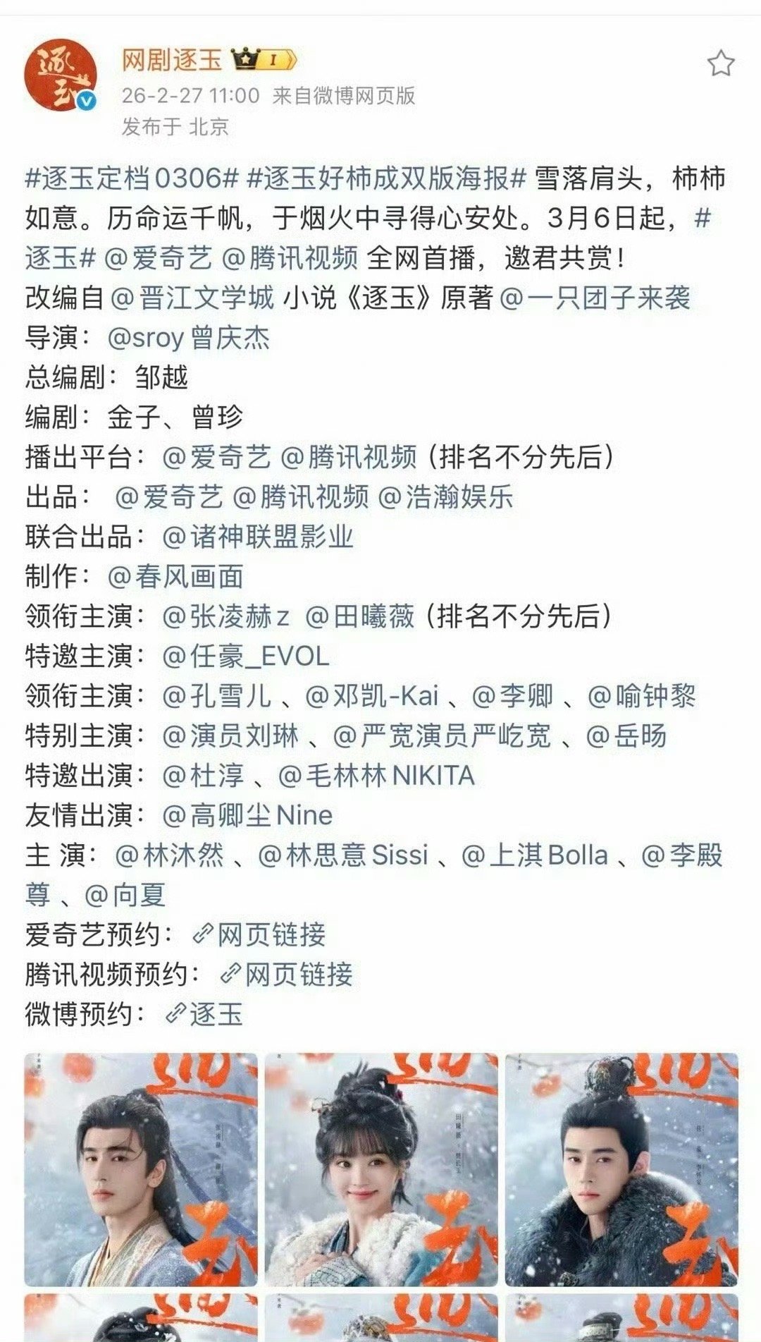 张凌赫、田曦薇主演的《逐玉》定档3月6日开播