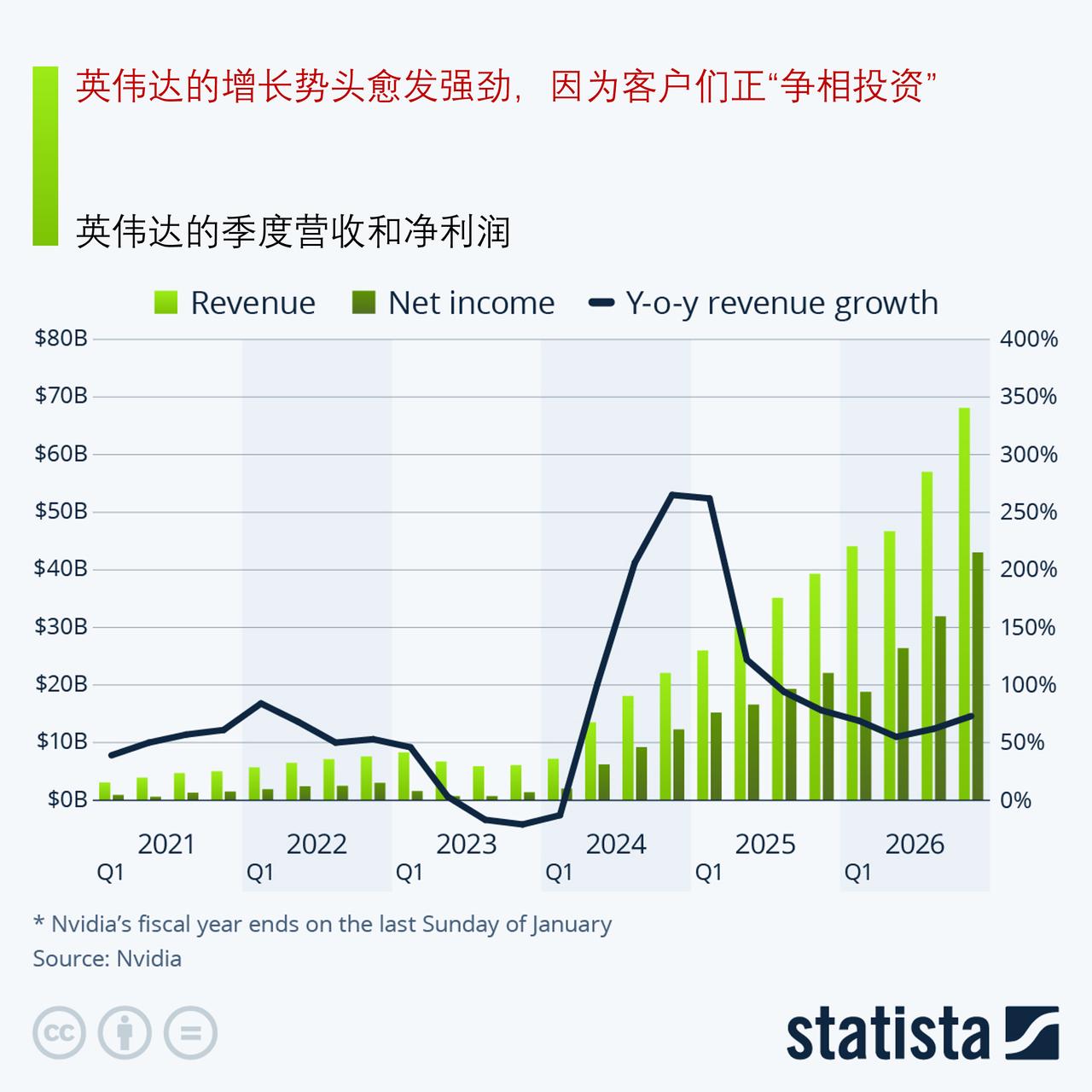 英伟达的增长势头愈发强劲,因为客户们正“争相投资” 2月25日,英伟达发布了其最新的财报,其过程与以往几周的预期一致:经过数周的期待,英伟达公布的业绩超出了预期,首席执行官黄仁勋再次表达了对人工智能的乐观态度,华尔街也松了一口气。然而,尽管又有一轮创纪录的业绩表现,投资者似乎仍未感到满意。2月26日上午,英伟达的股价下跌了多达 5%,因为投资者显然仍对人工智能的长期发展轨迹感到担忧。 从数据上看,英伟达的最新业绩并没有令人感到沮丧的理由——事实上,该公司的发展势头再次加快,并且在本季度还将进一步增强动力,这是根据英伟达对其 2027 财年第一季度的展望得出的结论。在截至 1 月 25 日的三个月里,英伟达的营收较去年同期增长了 73%,达到 680 亿美元,不仅超过了其自身的预期 650 亿美元,也超出了分析师的预期。 再一次,英伟达的数据中心业务成为了该公司创纪录季度业绩的核心所在。与一年前相比,其营收增长了 75%,占总销售额的比例超过了 50%。该季度净利润飙升至 430 亿美元,几乎是该公司 2023 财年(即没有受到人工智能影响的年度)全年利润的 10 倍。对于当前季度,英伟达预计营收将达到 780 亿美元,这意味着其增长率将达到 77%——较本季度 73%的增长率又有进一步提升。 在发布财报时所发表的评论中,英伟达首席执行官黄仁勋并未抑制自己的乐观情绪,他称计算需求正在以指数级的速度增长。黄仁勋表示:“企业对智能代理的采用率正在飙升。我们的客户正竞相投资于人工智能计算——这些为人工智能工业革命提供动力的工厂以及它们未来的增长。”当被问及他认为大型云服务提供商(如亚马逊、谷歌和微软)能否像目前这样继续维持其资本支出的增长,从而继续推动英伟达的增长时,黄仁勋同样充满信心:“我们现在已经看到了智能代理的转折点以及智能代理在全球范围内的实用价值,以及各地企业的这种价值。由于这一原因,您可以看到惊人的计算需求。这就是人工智能、计算带来的新世界,它是收入的来源。没有计算,就无法产生代币。没有代币,就无法增加收入。所以在这个人工智能的新世界里,计算等于收入。” 尽管英伟达的市值约为 4.5 万亿美元,且人工智能热潮的持久性仍存在诸多疑问,但一些分析师认为,英伟达的股票目前价格低廉。其市盈率(后市)约为 40 左右,与所谓的“科技七巨头”相比,英伟达的股价仅略高一些,而特斯拉则是个明显的异类,其估值完全不合常理。 与“科技七巨头“中的其他公司相比,英伟达的独特之处在于其当前的增长态势。过去 12 个月里,其他公司的营收增长率在 -2.9%(特斯拉)到 22.2%(Meta)之间不等,而英伟达的营收却增长了 65.5%——而且还在持续加速。此外,其毛利率超过 70%,英伟达的盈利水平是其同行们只能梦寐以求的。所以总的来说,没错,目前英伟达确实看起来“便宜”,但只有当你认为人工智能能够兑现其承诺时,这种看法才成立。