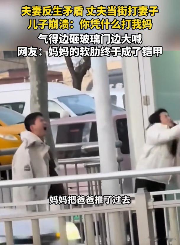 山东,一家三口走在马路上,一男子因为跟妻子拌嘴,二话不说,直接伸手暴揍了妻子一顿。一旁的儿子看到了,愤愤不平要帮助妈妈,没想到父亲还不以为然,认为教训老婆就是应该的。这下,可惹怒了儿子,直接就把妈妈护在身后,冲着父亲怒吼:你凭什么打我妈妈?你有资格打人吗?打人的父亲愣在一旁,不知所措,最后竟然若无其事的离开了。 培养出这样的男人,究竟是妻子的无能呢,还是丈夫本身就是有劣根性,直接就在马路上当众殴打自己的妻子。(正见新闻2月9日报导了此案件) 要说生女儿是小棉袄,生儿子那必定就是铠甲。 当最疼爱自己的妈妈被欺负的时候,小小男子汉就会选择站出来,挡在危险前面,保护好妈妈。 最近,山东的大街上,发生了令人愤怒的一幕。 一家三口正在马路边上行走,一对夫妻带着一个大概念初中的儿子。 三个人一前一后的走着,父亲则走在前面,儿子跟妈妈在后面慢慢走。 也不知道是嫌弃娘儿俩走的慢呢,还是有其他的矛盾,前面的父亲突然就开始回头责骂妻子。 而妻子无缘无故被骂,内心肯定也不大乐意的,就回了两句。没想到,面前的丈夫直接就动粗。 不仅推搡自己的妻子,甚至还伸手打人,给自己的妻子都打了蒙圈了。 毕竟这是在大庭广众之下,真把这儿当作家里客厅了,想要动手就动手? 但是丈夫却跟家常便饭一样,吆喝让妻子快点往前走。 不过刚刚被动粗,妻子很生气,气鼓鼓的不想动了。这个时候,男子又想要伸手,想要暴揍妻子一顿。 一旁的儿子早就看不下去了,他及时站了出来,把自己的妈妈护到了身后。 孩子刚刚目睹了父亲的暴力行为,一切都看在眼里,他开始大声谴责父亲:“你为什么要打我的妈妈?你凭什么殴打她?” 父亲看到儿子竟然大声斥责自己,一开始还想要对儿子发难呢,但是看到儿子情绪很激动,并且歇斯底里的吼叫,让父亲有些惊讶。 儿子看到父亲态度冷漠,丝毫认识不到自己的过错,也不跟妈妈道歉,孩子就更加暴怒了。 但是作为儿子,又不能对父亲动粗,他气的一直砸向旁边的铁皮门,想要把内心的委屈和不满全都发泄出来。 而那个无情的父亲呢,看到儿子跟自己站起来差不多高,也不敢跟儿子多产生争执,冷漠的看着母子俩。 妈妈看到儿子情绪失控,害怕儿子跟丈夫闹上,也害怕丈夫反过来打孩子,一直把丈夫往旁边推,意思就是让他快点离开,先回家去。 男人双手插兜,还真的回头就走了。 儿子看到绝情的父亲,伤心的在大街上流泪。但是要给孩子点赞,他敢于指责父亲的不是,面对妈妈被欺负、被伤害,这个男子汉敢站出来维护她了。 1.男子当街殴打自己的妻子,这个行为是否违法呢? 根据《治安管理处罚法》第四十三条规定,殴打他人或者故意伤害他人身体的,会被处以五日以上、十日以下行政拘留,并且还要处以200-500元的罚款。 很多人认为,夫妻之间的打骂就是家庭矛盾,但是法律早就规定,家庭成员之间的人身权利同样受到法律保护,暴力行为不会因为婚姻关系而免责,这位丈夫必定要受到法律的惩罚。 2.儿子看到爸爸殴打妈妈,他可以站出来反击自己的父亲吗? 虽然是要保护母亲,但是不可以直接动手反击父亲。否则,可能涉嫌违反《治安管理处罚法》甚至《刑法》中的故意伤害罪。 作为儿子,不可以以暴力还击暴力,如果必要的时候,必须站出来,那就应该采取合法、有效的行动去保护母亲跟家庭的安全。 如果说母亲确实处在遭受伤害的境况,可以正确反击,这是正当防卫。但是如果父亲已经停止殴打妈妈,这个时候最好不要继续进行反抗。 家庭成员之间,尽量不要产生暴力行为,主要的目的是制止暴力,可以及时报个警求助一下,或者申请保护令,才能更加安全有效。 不过,也要夸一下这个小小男子汉,曾经他是妈妈的软肋,如今他终于长大,也成为了妈妈的铠甲。 不管什么时候、什么地点,只要妈妈被欺负了,他都会站出来,呵护妈妈周全。 对此,大家都怎么看呢?
