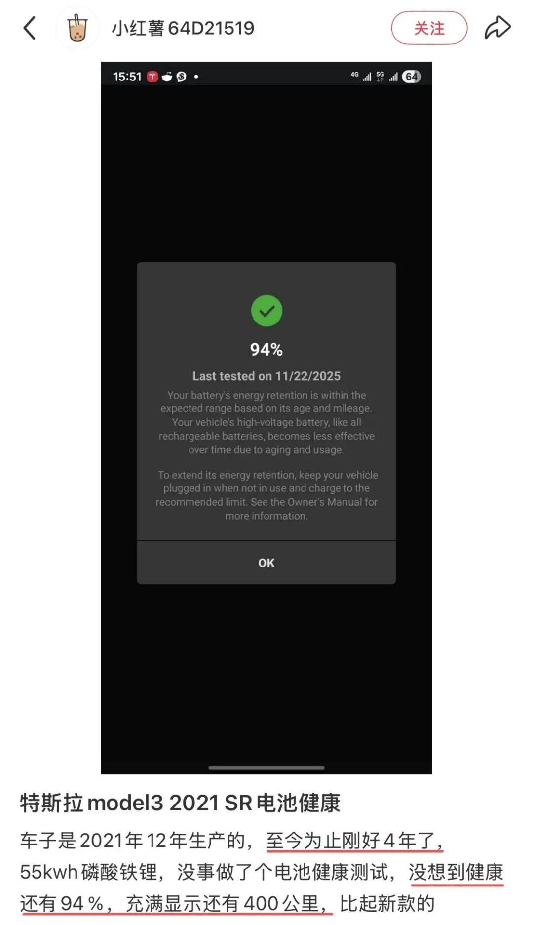 在社交平台上,也有不少车主点赞特斯拉耐久可靠的产品质量。小红薯64D21519 表示自己使用四年的Model 3在进行健康检测后发现,电池健康度高达94%。