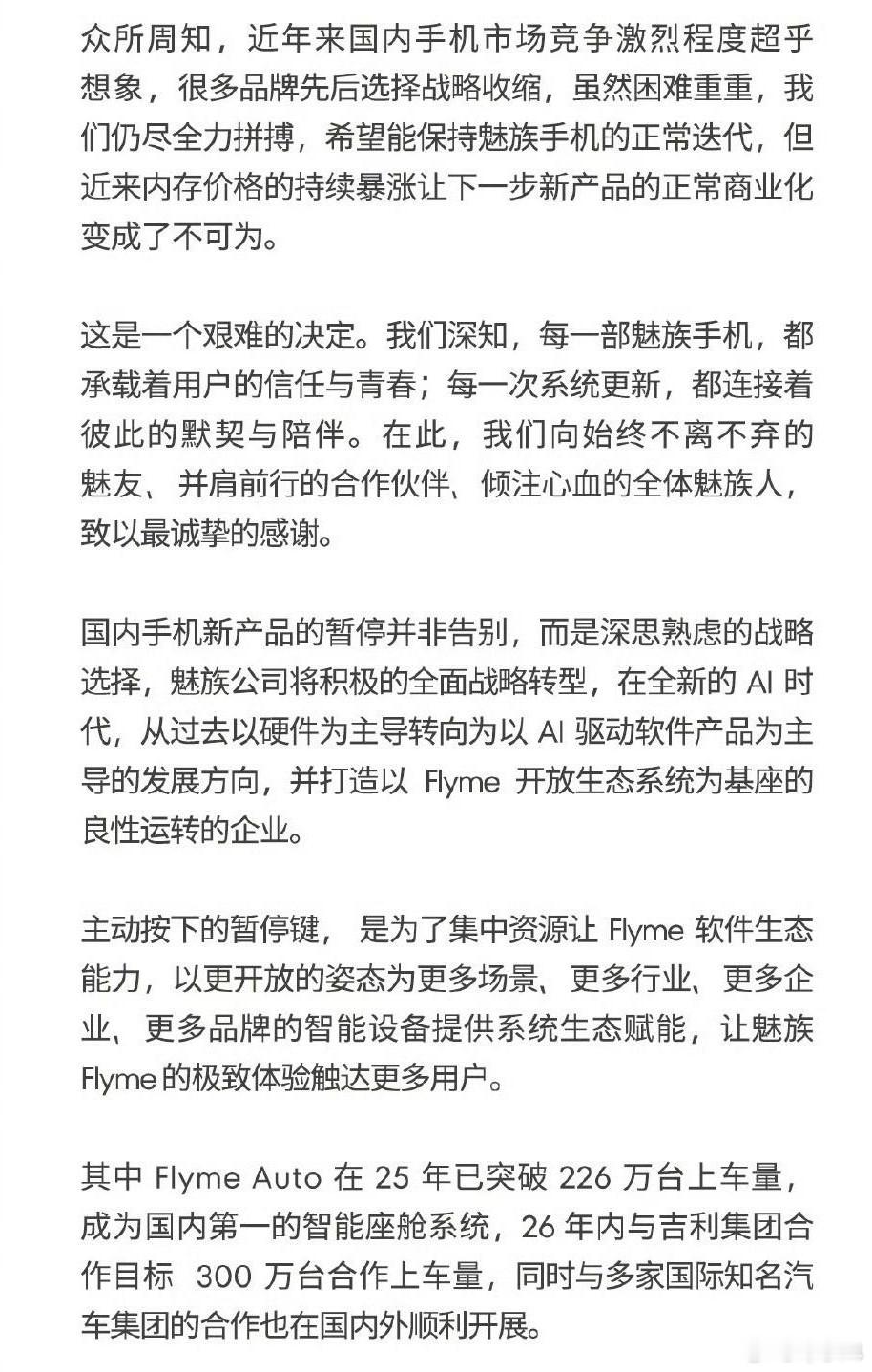 魅族现在的处境,是令人唏嘘的。我也算是老煤油了,早年魅族的音乐播放器、手机基本上是出一台买一台,用起来体验其实还不错,在那个百花齐放的年代,魅族就代表了一种独立自由的精神。这么多年过去了,手机圈早已变天,多强格局里早就没了魅族的影子,现在也暂停了国内手机新品业务,但给吉利系车子做系统,是风生水起。我倒是希望魅族能再“沉淀”一下,如果能满血复出是最好的,坚持做一个小而美的牌子,有自己最忠实的那一批粉丝,在当下的大环境里,也是难能可贵!怎么说呢?希望魅族能与我们在不远的未来,再次相遇!魅族公告魅族正积极接洽第三方硬件厂商魅族CEO说魅友在魅族就在魅族