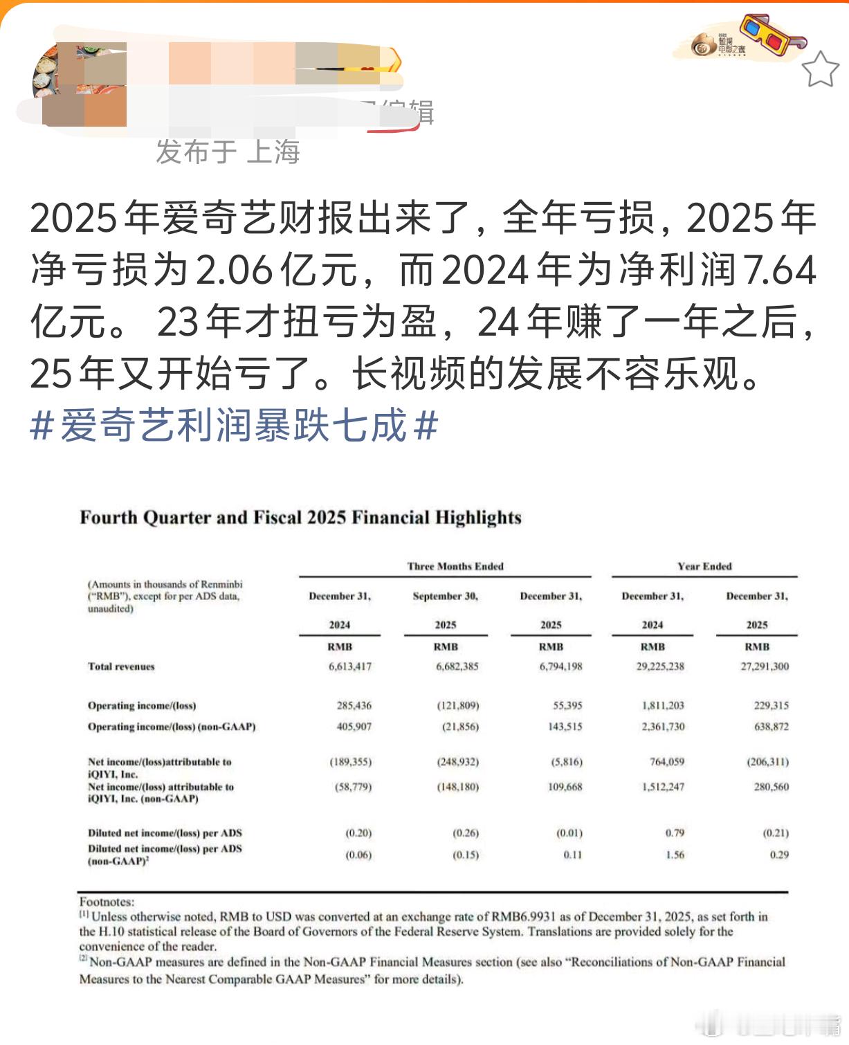 爱奇艺利润暴跌七成猕猴桃🥝2024年盈利,2025年亏大了!提名2025年的大剧哪部🥝亏了?