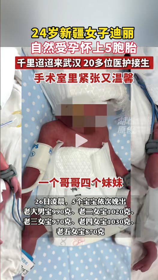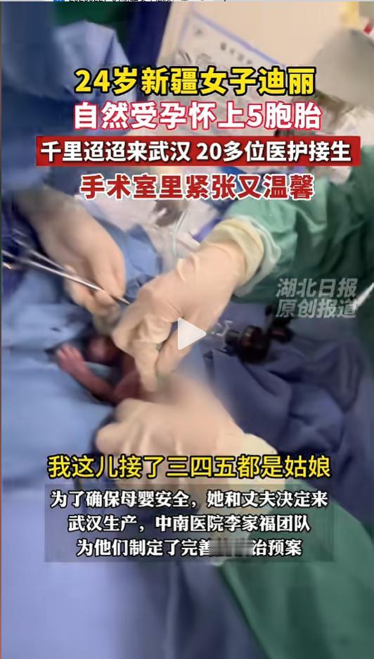 “简直是奇迹!”近日,湖北武汉,一女子在医院待产时,突然出现胎膜早破现象,医院紧急启动了剖宫产预案。该女子怀孕仅28周+6天,情况十分危险。在医生的不懈努力下,女子顺利产下了一男四女,五个宝宝情况都还不错。网友:母亲是全天下最伟大的人! 据媒体2月26日报道,该女子今年24岁,是新疆人。去年8月份,她自然受孕怀上了五胞胎,当地医院告诉她这属于危险妊娠。为了孩子和她的安全,她和丈夫决定远赴千里,去往武汉生产。 到达武汉后,接诊医院为她做了详备的救治方案。女子孕28周+6天的时候,意外情况还是发生了。当天晚上接近12点的时候,女子突然出现胎膜早破现象。医院立即启动了剖宫产预案。 短短十五分钟里,多个科室,20余名医护人员全部到位。在医生的努力下,女子顺利生下了五个宝宝,其中老大是个男孩,剩下四个全是妹妹。 医生介绍,五胞胎自然受孕的概率约为六千万分之一,他也是第一次亲眼见到。五个宝宝评分均在6分以上,生命体征相对稳定,最大的一个宝宝出生时有1030克,最小的870克。 网友看后表示,孩子的母亲实在是太不容易了。虽然现在医疗水平很发达了,但生育这个环节仍然是鬼门关上走一遭。为坚强的母亲点赞!为医护人员点赞!真心的祝愿五个宝宝健康成长! 信息来源:《24岁新疆女子迪丽自然受孕怀上5胞胎 ,千里迢迢来武汉生产,20多位医护守护接生,手术室里紧张又温馨。(记者:龙华 剪辑:心悦)》湖北日报