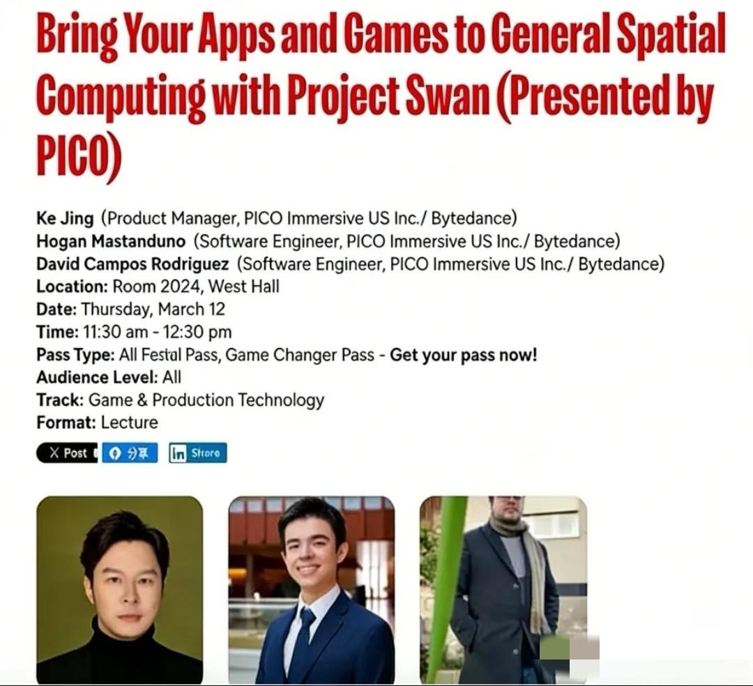 抖音Pico的“Project Swan”来了!将在GDC展示图形能力等。硬件超绝,极致轻薄解决传统痛点,超高精度显示逼近裸眼真实。全栈自研超厉害,支持手势等交互,可实现应用同空间并行。这是XR行业关键节点,标志着Pico进军高端赛道,不仅硬件强,还开放工具链,未来可期,看它如何重塑XR格局!