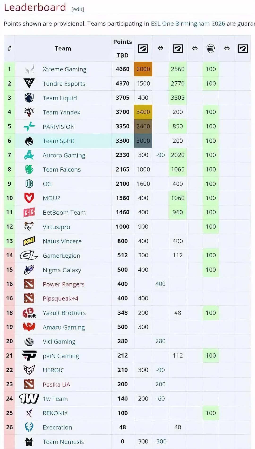 XG战队暂时登顶EPT积分第一名 目前XG已经确定进入四强,所以按四强的积分加上去,上个赛季也是第四名,而上个赛季的前三对手,一二名第一轮淘汰,第三名小组垫底,所以目前XG暂时排名第一。其他的等淘汰赛结果才能确定。 这个应该是历史少见的,YB和VG排的很靠后,目前还剩两个比赛,并且直邀是前十二名的队伍,所以XG石油杯直邀基本是稳了。