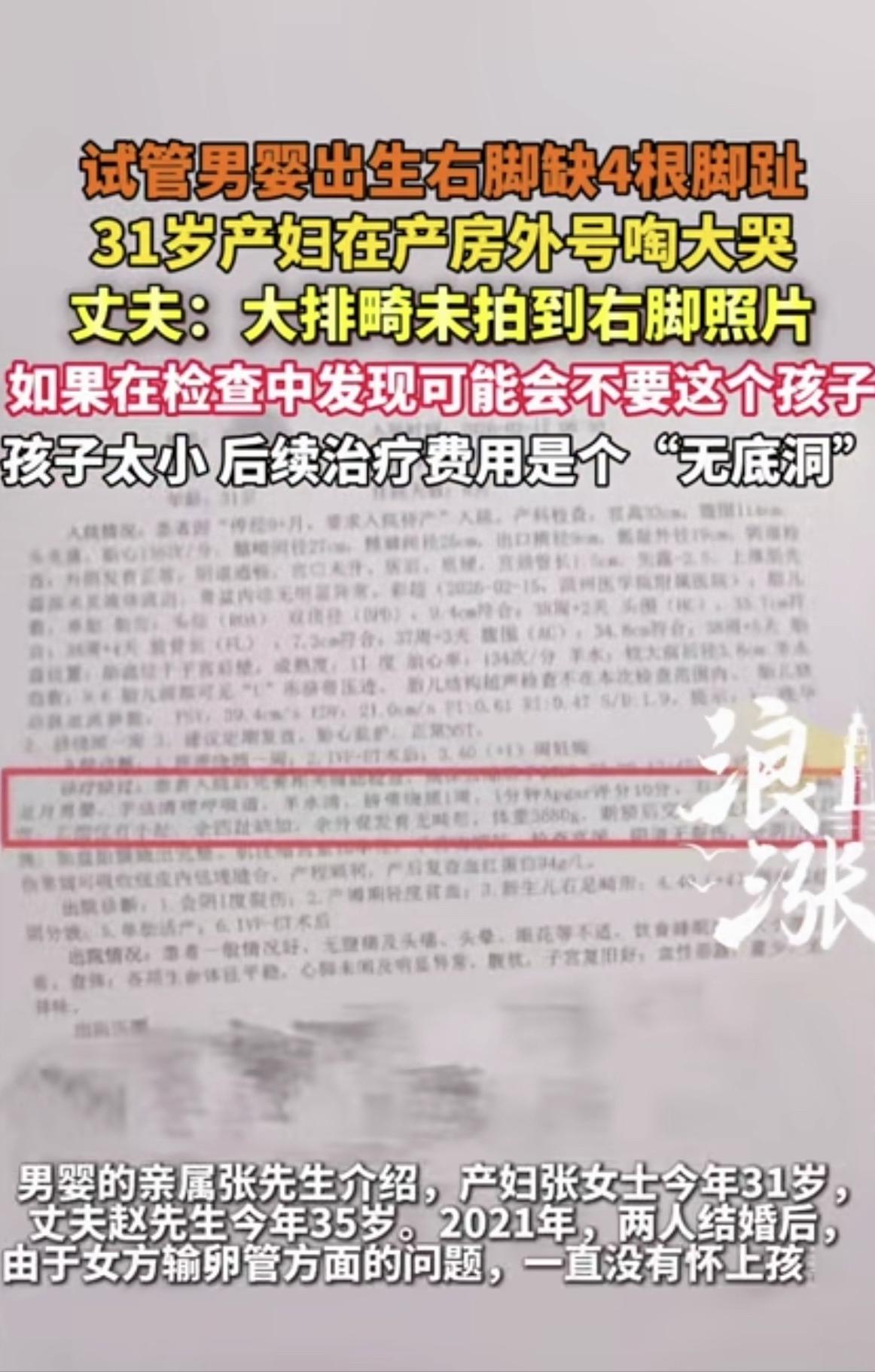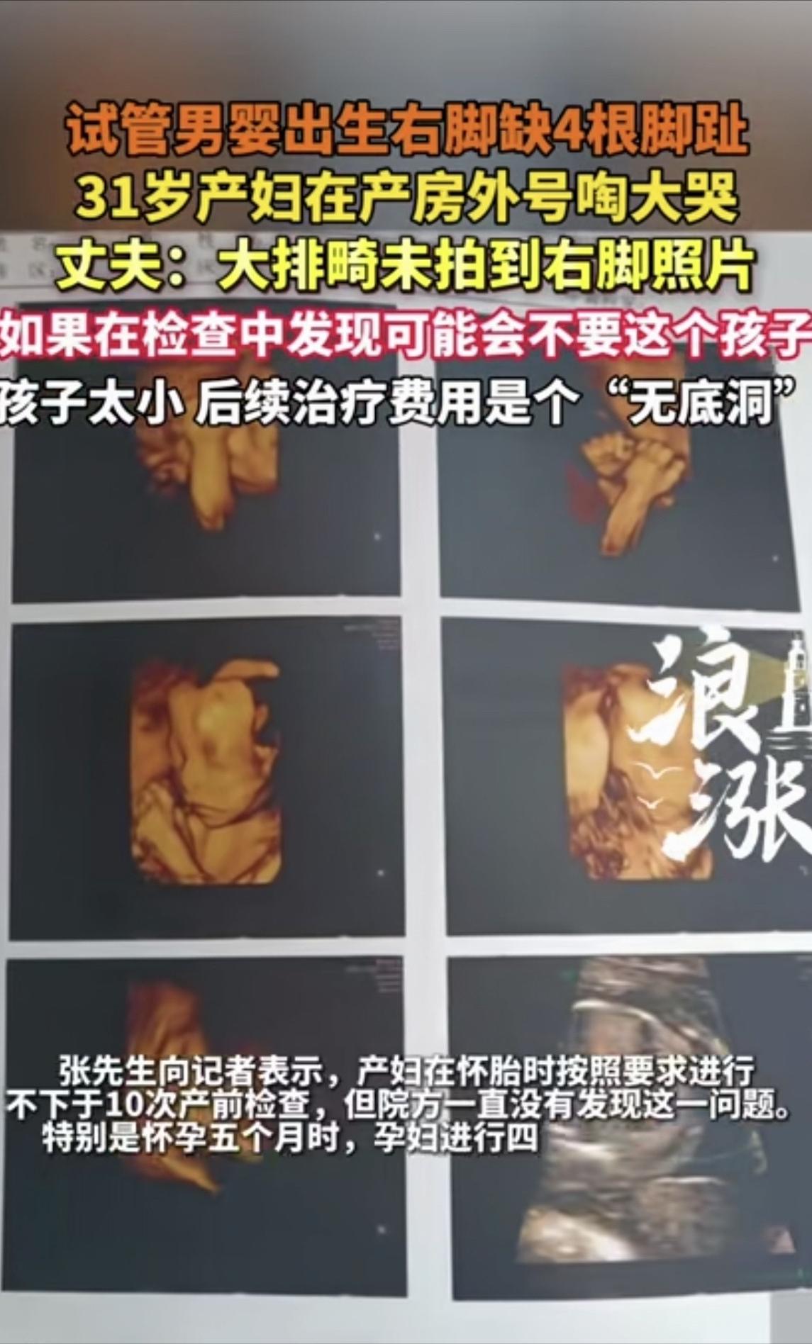 “崩溃了!”一31岁女子输卵管有问题,无法自然受孕,她和35岁丈夫去做了试管,成功怀孕后,女子做了10次产检,怀孕5个月时,又做了四维大排畸检查,胎儿一切正常,可她大年初四生下孩子,竟然发现他右脚缺4根脚趾,女子崩溃大哭。丈夫怒了:如果检查时发现,我们不会要这个孩子,后续治疗费是无底洞。 说句不好听的,这孩子从出生那一刻起,就注定要背着一个残缺的身体过完这辈子。 更令人愤懑不平的是,这一切本皆可规避。诸多纷扰、种种乱象,本不应降临。若早有筹谋,又怎会落得如今这般局面。 大年初四,于山东滨州的一家医院产房内,赵先生夫妇怀揣着满心的欢喜,翘首以盼,等待着迎接他们那即将呱呱坠地的宝贝儿子。 历经四年试管之艰,投入十几万资金,无数的期盼与等待在时光中沉淀。今朝,那翘首以盼的日子终至眼前,心中满是苦尽甘来的欣慰。 可当护士把孩子递过来的那一刻,两口子的脸瞬间就白了。 他们小心翼翼地掀开右脚的包被,看到的不是五根粉嫩的小脚趾,而是一片刺眼的空白——那里只剩下孤零零的一个大脚趾,剩下的四根脚趾不知去向。 更让他们心惊的是,孩子那条右小腿明显比左边细弱一圈。 张女士当场就崩溃了,躺在产床上哭得上气不接下气。 赵先生宛如被无形的钉子钉在了原地,脑袋里一片嗡鸣。那些过去五年间,为了这个孩子投入的真金白银,如潮水般在他脑中翻涌。 说起来,这对伉俪着实艰辛非常。他们于生活的浪潮中奋力搏击,尝遍酸甜苦辣,其中的不易,实非言语所能尽述。 女方输卵管出现堵塞状况,受孕之路困难重重,自然怀孕的可能性微乎其微,基本难以实现。自2021年伊始,31岁的张女士与35岁的赵先生,便毅然投身于试管婴儿这场漫长且充满挑战的征程之中,开启了他们求子的艰辛之旅。 四载有余,往来医院无数趟,承受针扎之痛、吃苦遭罪亦无数。十多万积蓄如流水般消逝,直至今年,方换来这所谓的“成功结晶”。 你说他们对这次怀孕上不上心? 在2026年整个孕期里,十次产检她从未缺席,次次按时前往,其准时程度堪比上班打卡,展现出对腹中新生命满满的呵护与期待。 尤其在怀孕五月时,那场被称作“大排畸”的关键检查,夫妻俩怀着一颗忐忑的心前往。他们满心忧虑,仿佛那检查结果是命运抛出的未知谜题。 结果呢?四维彩超报告上白纸黑字写着"未见明显异常"。 当时医生拍着胸脯说没问题,两口子悬了半年的心总算放下来了。 谁能想到,这张让他们安心的报告,现在看来简直是天大的讽刺。 "如果我们产前就知道是这样,根本不会让他来到世上受罪。" 产房之外,赵先生伫立着,眼眶泛红如染血霞。他启口说话的刹那,嗓音颤抖,似是寒风中飘摇的孤叶,尽显内心的波澜。 有人可能觉得这话太冷血了,但说实话,换成任何一个普通家庭,恐怕都会有同样的想法。 这不是不爱孩子,这是被现实逼到墙角的无奈。 你算算这笔账:后期矫正手术、漫长的康复训练、特殊的鞋子和辅具,初步预算就要三十万往上。 三十万是什么概念?对于一对刚掏空家底做试管的工薪夫妻来说,这不是一道选择题,而是一个足以压垮下半辈子的无底洞。 最令赵先生感到愤懑憋屈之事为何? 是医院在那场价值千金的检查中,剥夺了他们身为父母唯一的"否决权"。 如果当时查出来了,他们至少还有选择的余地。可现在呢?孩子已经生下来了,你让他们怎么办? 带着满腔怒火,赵先生冲进了医院的办公室讨说法。 得到的回复却像是隔靴搔痒,听得人直想骂娘。 院方的逻辑很直接:超声波不是透视眼,胎儿在肚子里怎么蜷缩、羊水多少、体位如何,都会挡住那几厘米长的脚趾。 说白了就是:不是我们不想查,是真的看不见。 更让普通人难以接受的是,在目前的医学规范里,脚趾这种"末端小畸形"根本就不在强制排查的红线之内。 换句话说,就算医生真的漏看了,从规定上来讲,人家也不算违规。 这就是医患之间那道巨大的认知裂缝。 家长眼里花一千多块钱做的大排畸,那是"全身扫描",恨不得连孩子有几根头发都给数清楚。 但在医学标准里,它只是一张保大不保小的"核心结构图",心脏、大脑、脊柱这些大件没问题就算过关。 至于手指与脚趾?很遗憾,它们并不在必须检查的清单之列。 这种信息不对称,坑了多少家庭? 光是2025年,全国类似的产检纠纷就超过了一千起,剧本几乎一模一样:家长哭天抢地,医院两手一摊,最后不了了之 当下,国家卫生健康委员会已着手介入调查事宜,相关工作正有序推进,后续情况值得关注。 赵先生也没闲着,律师已经请好了,他们要把医院告上法庭。 不光要一个说法,更要一笔能支撑孩子未来的赔偿金。 卫健部门在调查的同时,也悄悄往外发了一份提醒,算是给其他准爸妈敲个警钟。 如果你的产检报告上写着"肢体显示不清",千万别当没看见 信息来源: 极目新闻|试管男婴出生右脚缺4根脚趾,家属称大排畸未拍到,卫健委介入