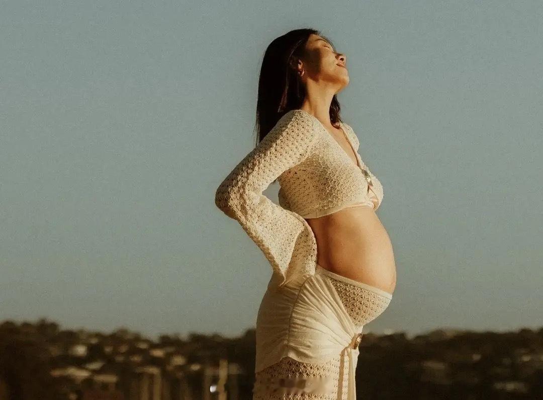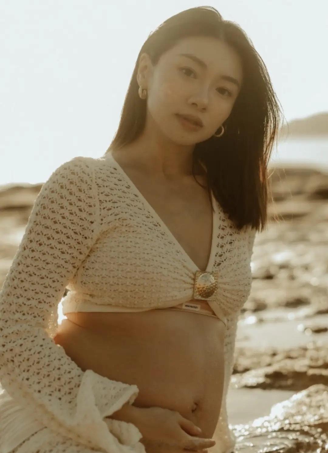 36岁程晓玥晒二胎孕妇照,挺着肚子坐在海边沙滩上,太拼了!第二次怀孕明显胖了不少,腰身周围已经有赘肉了,平时一天吃好几顿饭,营养丰富,为了宝宝健康发育,短暂胖一些完全可以理解。