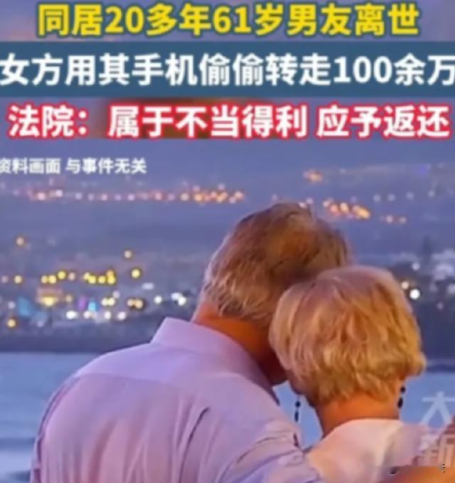 重庆,一男子跟女友同居,同居期间男子不幸离世。女友当时也没有及时告知他的子女,而是悄悄的把男友手机里100多万元给转走了。因为女子也没有跟男友领证,男友并未立下遗嘱,他的子女以及母亲应该是合法的继承人。女子可不管,卷钱之后就要溜走,这件事被男友的女儿看到之后,立刻就把女子给上诉了,要求她全额返还这100万元。 私自转走男友的钱合法吗?首先,没有领证就是不合法的,最后,相关部门的判定也下来了。(大风新闻报道了这则案例。) 同居关系,有权利继承男友的财产吗?答案其实早就揭晓了。 一男子黄某,跟前妻离婚之后,一直独自带着女儿生活。 要说这个黄某,还是当地非常有名气的画家,他的绘画非常有风格,所以名下也攒下了不少钱款。 黄某不仅有存款,还有房、有车、有名画珍藏,可以说家世丰厚。 离婚带娃期间,黄某就认识了一位女子杨某。两个人一见如故,感情还是非常不错的。 黄某就对杨某展开了追求,并且也把杨某也追到了手。二人确定为男女关系之后,就搬到一起居住。 一晃就20年过去了,黄某也已经60多岁了,他的女儿也长大了,还有一个母亲在世。 某一天,黄某突发疾病,当时就昏倒在地。杨某见状,先给男友送去医院,但是当天并没有抢救过来。 杨某看到男友已经离世,就开始想要为自己的未来打算。 两个人同居了20年,却没有领证,自己也就这样稀里糊涂、无名无份了跟了他这么长时间。 如今,男友离世,还有直系亲属在,作为女友,是没有资格继承财产的。 另外,黄某走的匆忙,也没有立下遗嘱,就是说,对于自己真的是一点交代也没有。这么多年,她可能真的就是一场空,什么也没有得到。 想到这里,杨某想起来,男友的手机里账户上有100多万元的钱款,她也是知道密码的,立刻就把这100多万转到了自己的名下。 完成这一切之后,杨某才赶紧打电话联系了黄某的女儿黄女士,告诉她,父亲已经没了。 之后黄女士就过来帮助父亲操办了后事,就在给父亲整理遗物的时候,她看到父亲的钱款被转走了,瞬间就炸了锅。 而钱款的接收者,竟然就是父亲的女友杨某。黄女士过去找她对质,但是却被杨某一口拒绝,之后甚至还想要直接溜走。 事不宜迟,黄女士立刻就把杨某给上诉了,要求她立刻返还这100万元。 面对审讯,杨某的抗辩是:我照顾老黄这么多年,熬过了最难的日子,就算没有领证,我也有苦劳啊,这笔钱就是我应得的! 但是法律讲究的是依据、并不是情分。 相关部门是怎么判定的呢? 工作人员在审理之后认定,所谓的照顾,只不过是伴侣之间的互相扶持,达不到法律认定的“扶养”标准。另外,黄某没有立下遗嘱,其名下也有合法继承人,包括女儿跟母亲,他们才有权合理继承。 杨某作为女友,不是法定配偶,不可以擅自转走存款,此举已经构成不当得利。 最后判定,杨某必须要返还全部100多万元存款。 本案释法: 男子跟女友同居,没有领证。走的很突然没有立下遗嘱,名下有女儿跟母亲。他的遗产女友可以继承吗? 根据《民典法》第1127条规定,法定继承的第一顺序是:配偶、子女、父母。 然而,男子黄某并没有领取结婚证,女友杨某不是法律任何的配偶,所以不能作为第一顺序继承人。 从法律上来看,对继承人以外的依靠被继承人扶养的人,或者继承人以外的对被继承人扶养比较多的人,可以适当的分配遗产。 由此可知杨某作为女友,照顾的比较多,她其实是有资格分配到一定的财产的。只不过错就错在,不可以隐瞒他人私自转走钱款,此举已经违法。 不可否认的是,杨某这20年的付出也是真的,对伴侣的照顾也是真的,但是错就错在,把“情理”当成了“法理”,还偷偷转账。如此一来,自己的行为就很被动了。 说到底,感情再浓厚,还是要讲究法律。但是作为长达20年的扶养人,杨某是有机会分配的,非常可惜的是,一念之差。 看完本案,您作何感想呢,不妨评论区里留言,一起来讨论吧!