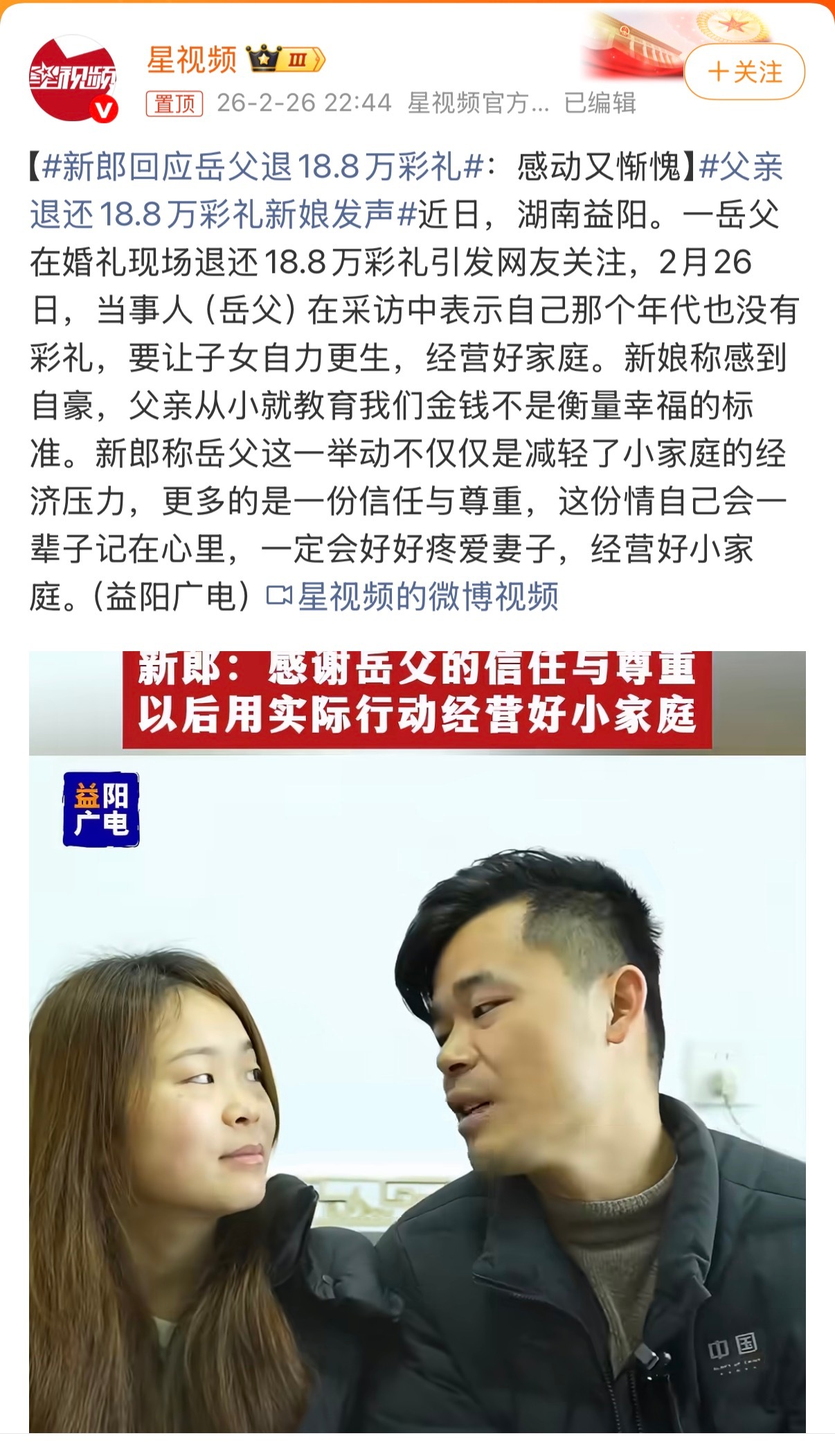 父亲退还18.8万彩礼新娘发声 现在彩礼被污名化了,很多人拿着彩礼的借口去敲诈。