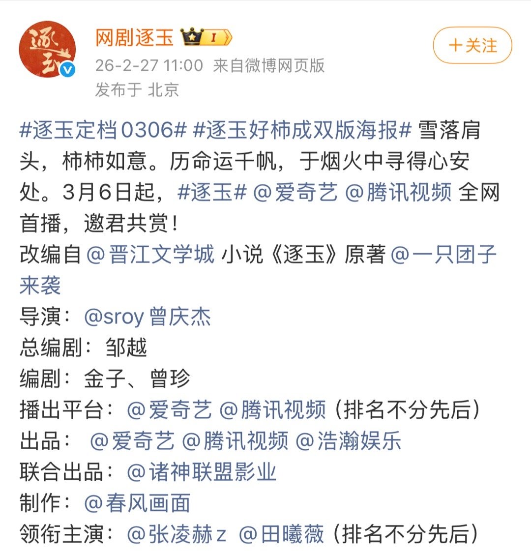 终于来了,张凌赫 田曦薇 逐玉官宣定档3.6!!! 🥝🐧双平台播出你们会看吗?
