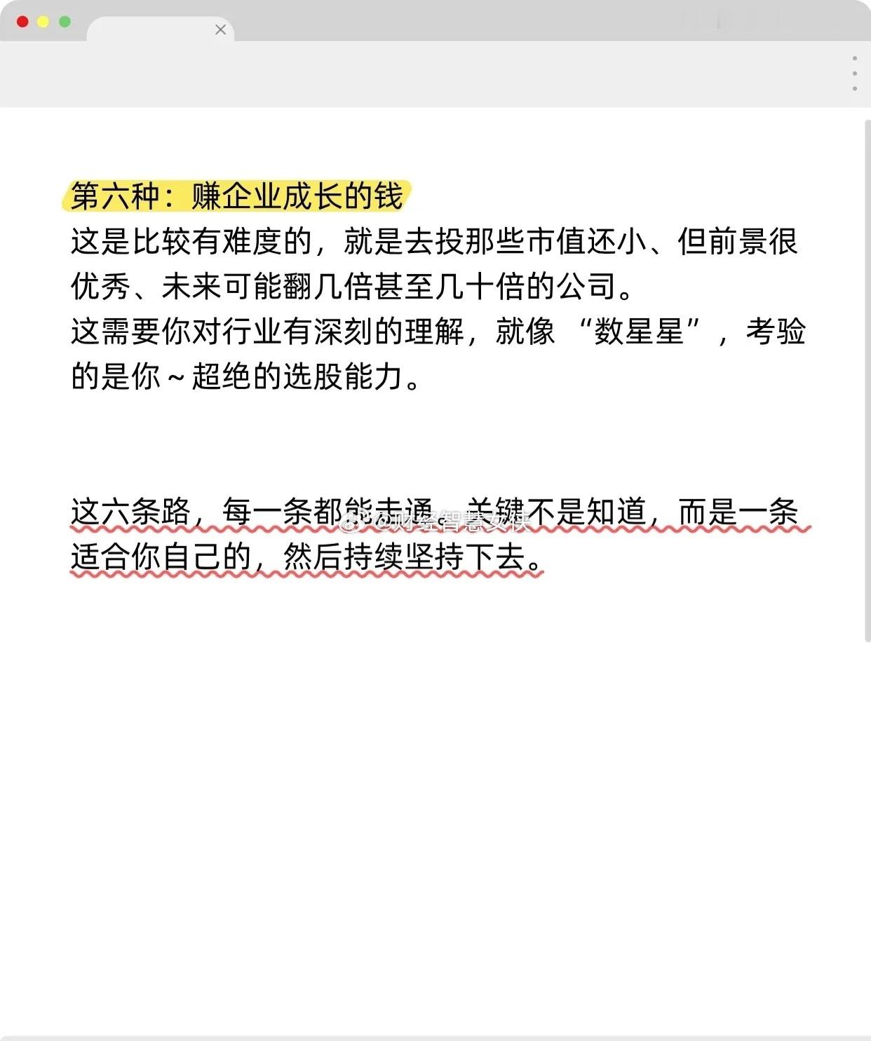 1. 等大跌,买指数平时不用操作,只用闲钱等待“股灾式”大跌(如24年9月、25年4月),然后买入宽基ETF,靠市场反弹赚取收益(如30%),无需选股。2. 专注一两只股票,反复做波段精选一两只优质股,保留现金,通过“涨卖跌买”来回操作,不断降低持仓成本,理想目标是将成本做成负数。3. 攒股,收股息买入股息率约5%的国企或央企股票,在股价低迷时入手并长期持有,主要赚取稳定分红,同时博取股价上涨的资本利得。4. 看懂周期,反向布局避开市场热门板块,寻找被低估的冷门板块(如2022年的银行股)进行逆向投资,等待板块轮动和价值回归。5. 价值投资,等好公司打折只买行业龙头公司(“数月亮”),在市场情绪低迷、价格极度便宜时分批重仓买入,长期持有,等待其价值回归并获取数倍回报。6. 赚企业成长的钱投资市值小、前景好、未来有巨大增长潜力的公司(“数星星”),这需要对行业有深刻理解,是难度最高的一条路径。