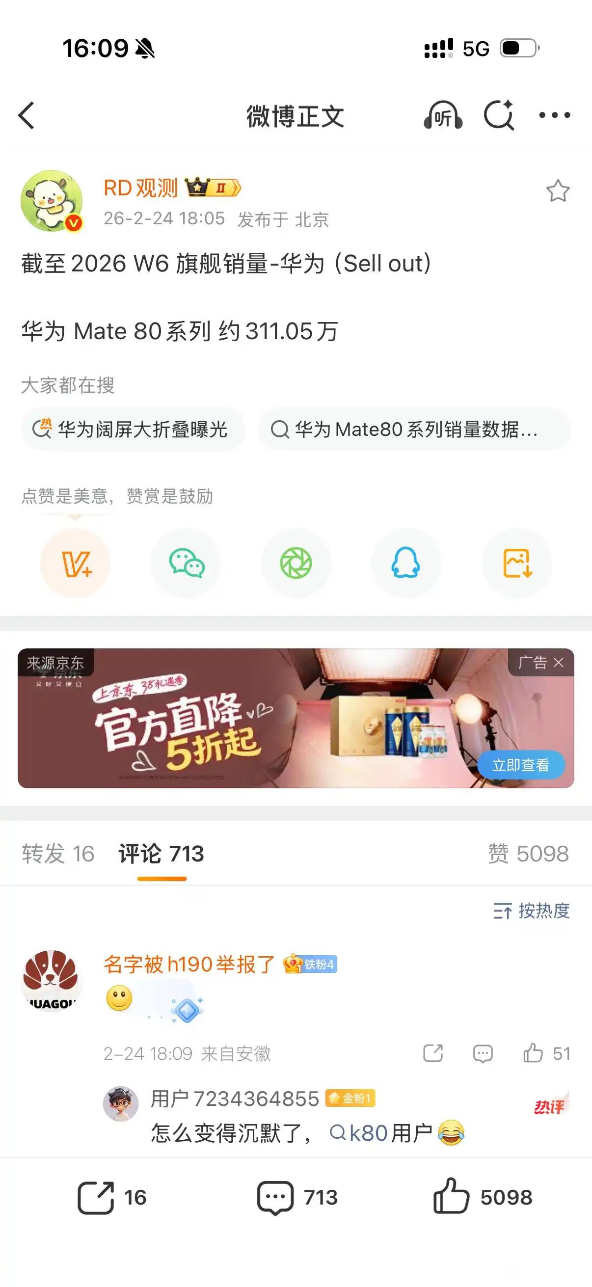 华为Mate 80系列销量太猛了!据数码博主“RD观测”消息,截至2026年W7,其累计销量约达357.89万部。春节假期那周(2026年W7)单周销量更是高达46.84万部,超越首销期,创历史最高纪录。