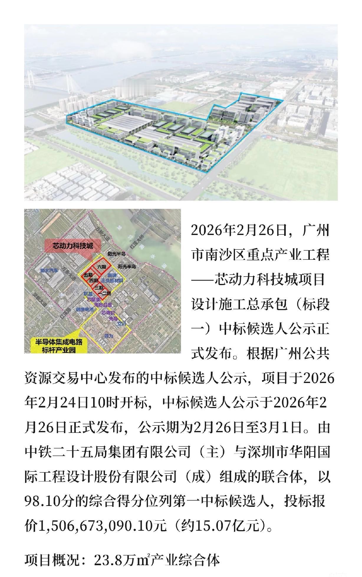 广州南沙芯动力科技城标段一有结果了!中铁二十五局和华阳国际联合体中标,报价约15.07亿,得分98.10分。项目在保税港制造业园区,建总部、公寓等,工期3年。总投资261亿,引入绿色企业,聚焦储能,达产后年产值超20亿,能给南沙绿色产业添新力~