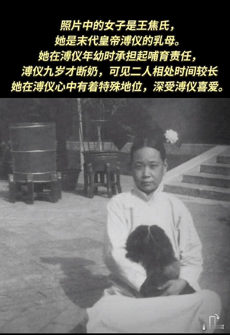 照片中的女子是王焦氏 他是末代皇帝溥仪的乳母。 她在溥仪年幼时负担起哺育责任。 溥仪9岁才断奶,可见二人相处时间较长。她在溥仪心中有特殊地位,深受溥仪喜爱。