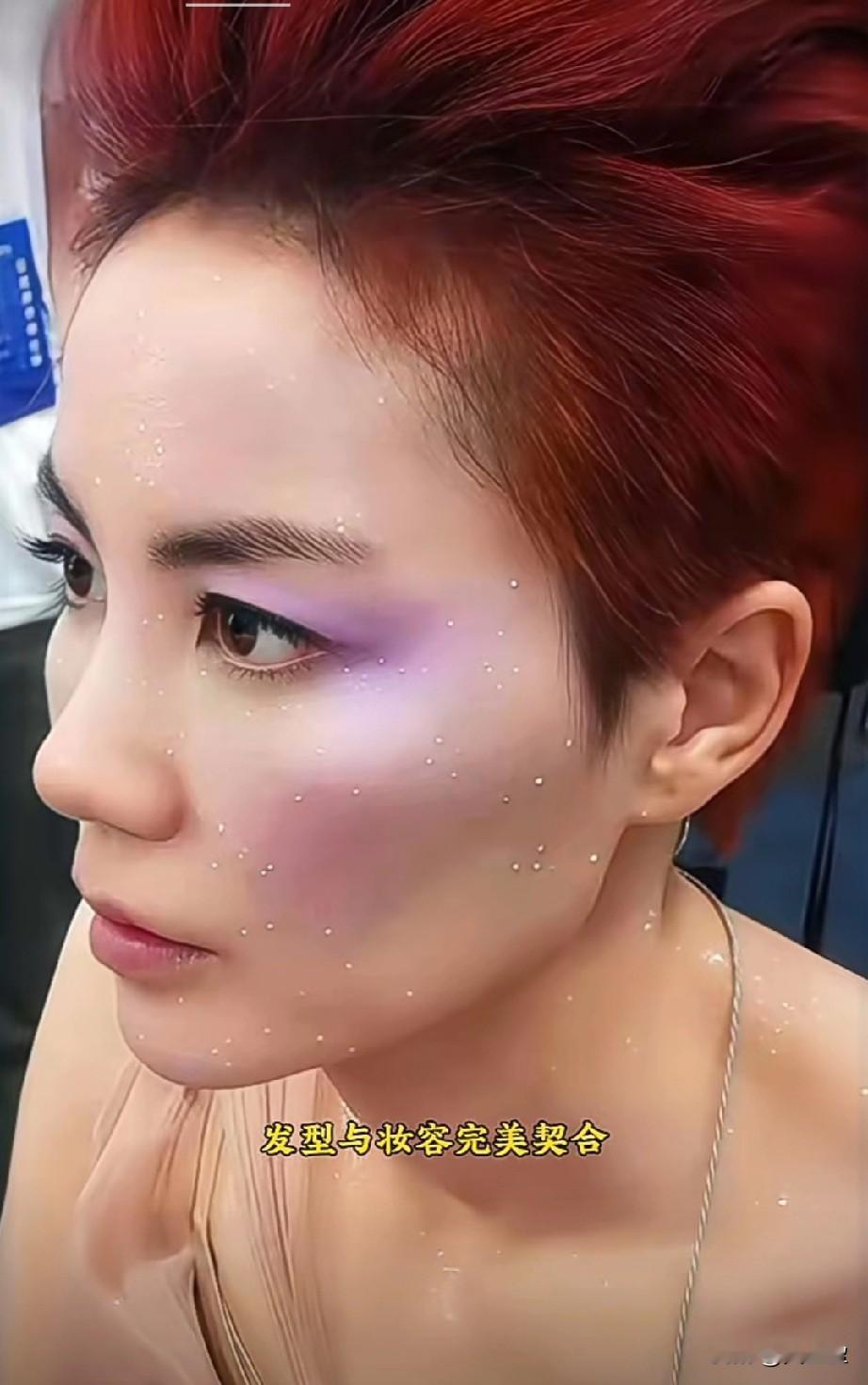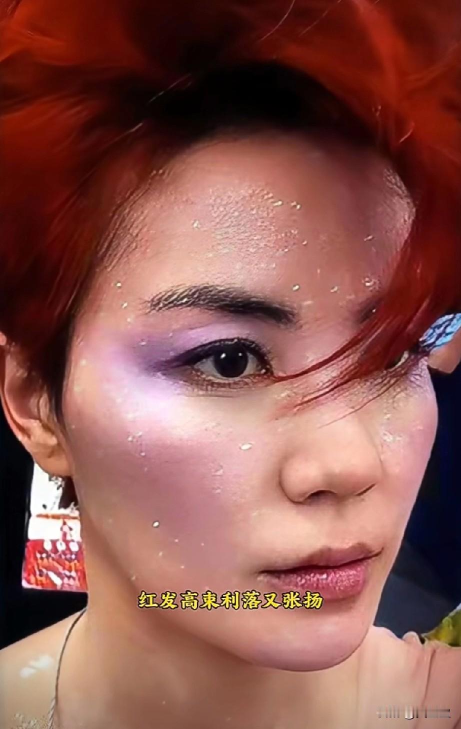 王菲这张妆容堪称高级感范本! 红发高束利落又张扬,如焰般衬得肤色愈发清透。紫调眼妆晕染出空灵意境,细碎亮片满缀脸颊与肩头,宛若星子坠落。发型与妆容完美契合,冷艳中透着灵动,每一处细节都在诉说不被定义的美。