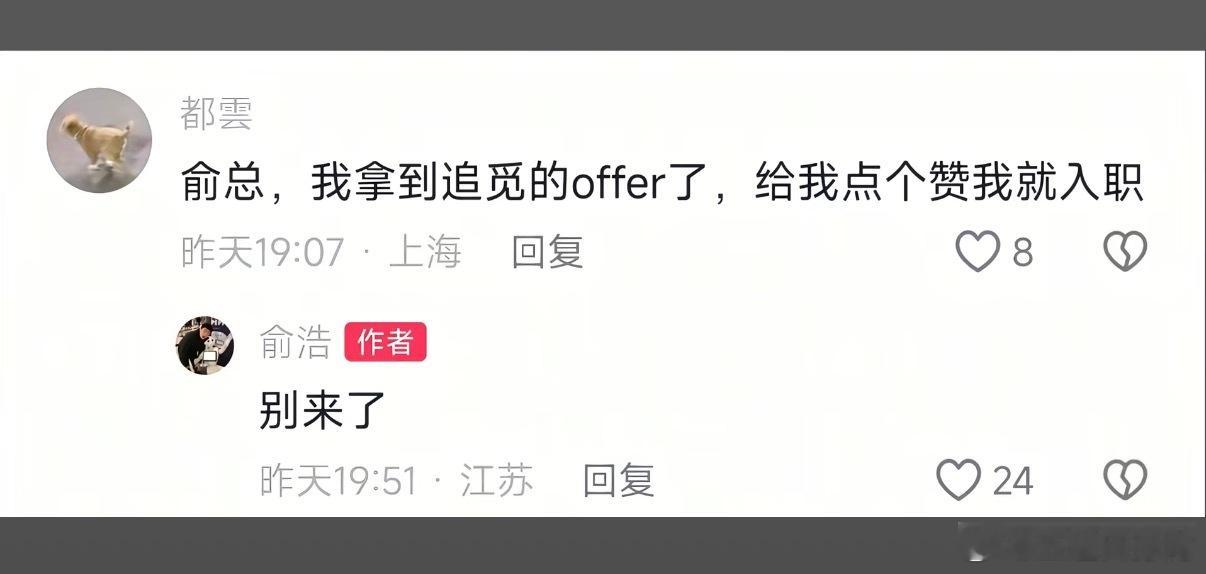 俞总还能刷到么。俞总你这个点赞了我就去入职追觅造火箭去