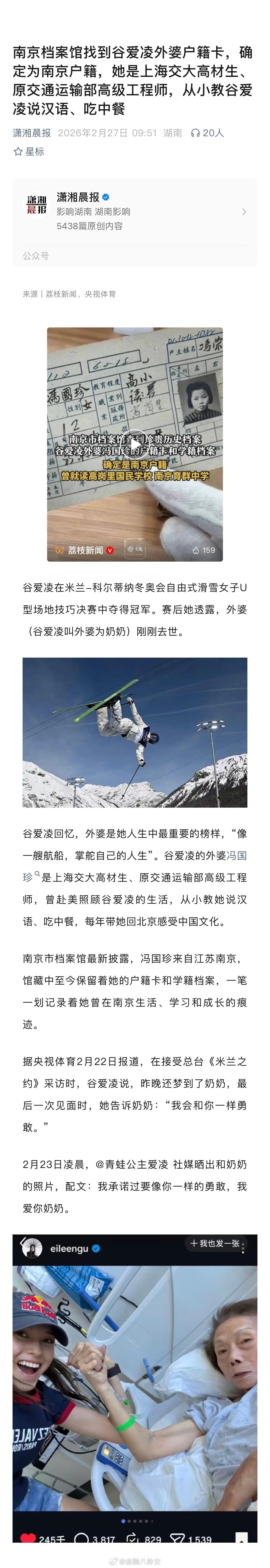 南京档案馆找到谷爱凌外婆户籍卡,确定为南京户籍,她是上海交大高材生、原交通运输部高级工程师,从小教谷爱凌说汉语、吃中餐南京档案馆找到谷爱凌外婆户籍卡