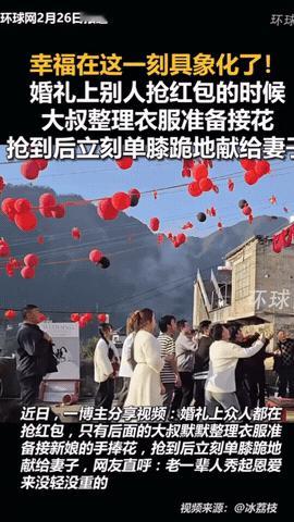 幸福在这一刻具象化了!2月25日,云南,“这就是长辈的爱情吗~”新人扔出手捧花,本来在旁观的叔叔冲过来抢到,一路小跑来到媳妇面前,单膝跪地送上,网友:两口子太幸福了!浪漫不分年龄。 婚礼现场,阳光正好,红色的气球在风里晃得人心里发暖。手捧花一抛出来,一群年轻人都蹦着去抢,谁也没注意到人群后面的叔叔,他几乎是条件反射一样冲了出去,动作比小伙子们还利落。 他一把攥住那束花,连灰都没来得及拍,就攥着花一路小跑,朝着不远处正在帮着收拾喜宴的媳妇跑过去。阿姨当时还系着围裙,手里还拿着刚擦完桌子的抹布,看见他单膝跪在自己面前,整个人都愣了,下意识就往后躲,可眼睛里的笑意根本藏不住,连眼角的皱纹都跟着软了下来。 这一幕被人拍下来传到网上,瞬间就戳中了好多人。有人说,这才是爱情最真实的样子,不是年轻时的轰轰烈烈,而是走过半辈子,还愿意把旁人眼里的“仪式感”,认认真真地捧到你面前。也有人说,浪漫从来不是年轻人的专利,那些藏在柴米油盐里的惦记,那些在众人面前愿意为你弯腰的瞬间,才是最动人的。 可笑着笑着,又有点感慨。我们总觉得浪漫需要昂贵的礼物、盛大的仪式,却忘了,真正的浪漫,从来都和年龄无关,和金钱无关。它是叔叔冲出去抢花的那股劲,是阿姨嘴上嫌弃眼里却藏不住的温柔,是两个人一起走过那么多年,还能把对方当成手心里的宝。 现在的人好像越来越怕麻烦,觉得婚姻就是搭伙过日子,没必要搞那些虚头巴脑的东西。可恰恰是这些“虚头巴脑”的瞬间,才让日子有了温度。就像这束手捧花,它不是什么名贵的东西,却是叔叔用行动告诉阿姨,这么多年过去了,你依然是我想用心对待的人。 这束被抢来的手捧花,比任何昂贵的珠宝都更有分量。它提醒我们,爱情可以很简单,只要你愿意,随时都可以给身边的人制造一点小浪漫。 各位读者你们怎么看?欢迎在评论区讨论。