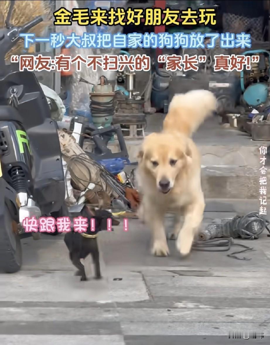 泪目了!一位大叔养了一只小狗,平时就非常宠爱,还经常带它出去玩,这期间小狗认识了附近的一只金毛狗狗,这以后金毛狗狗经常来大叔店里找小狗玩,而每次大叔也都和金毛狗狗打招呼,下一秒就把自家的狗狗放出来,让它和金毛出去玩玩。 每次小狗和金毛都很开心,像极了我们小时候同学来找我们玩,那种惧怕父母不让出去的感觉,而一旦放出去了,那种开心简直妙不可言。当它们玩好后,金毛狗狗都会把小狗送回来,然后再回去,也真的是一位尽心尽责的好朋友。有这样不扫兴的家长可真的是非常幸福!