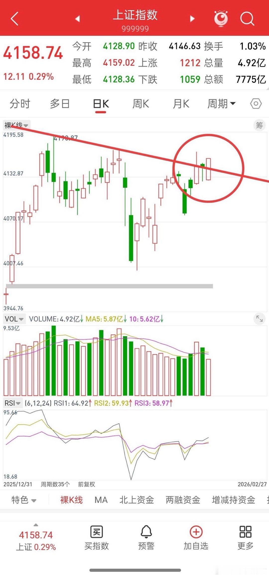 春节期间复盘上证指数的K线图,惊出一身汗,1、月线,1月份创出4190点的最高点,但MACD红柱却比11月份的短,这是顶背离呀!2、月线,MACD红柱渐短,趋势空头,3、周线,MACD柱线已经红变绿,趋势空头;4、日线,连续多日成交量萎缩,成交量没上5日均量,这是极度危险信号,场内资金越来越少。 综上技术指标,结合恶劣的国际环境和萧条的国内经济,4190点大概率是个顶(起于2024年9月下旬,走牛也已经1年多了),后面应有一波大级别的回调才会见底(4000点必破,到38**是大概率)。 下跌不言底,后续做空为上策!