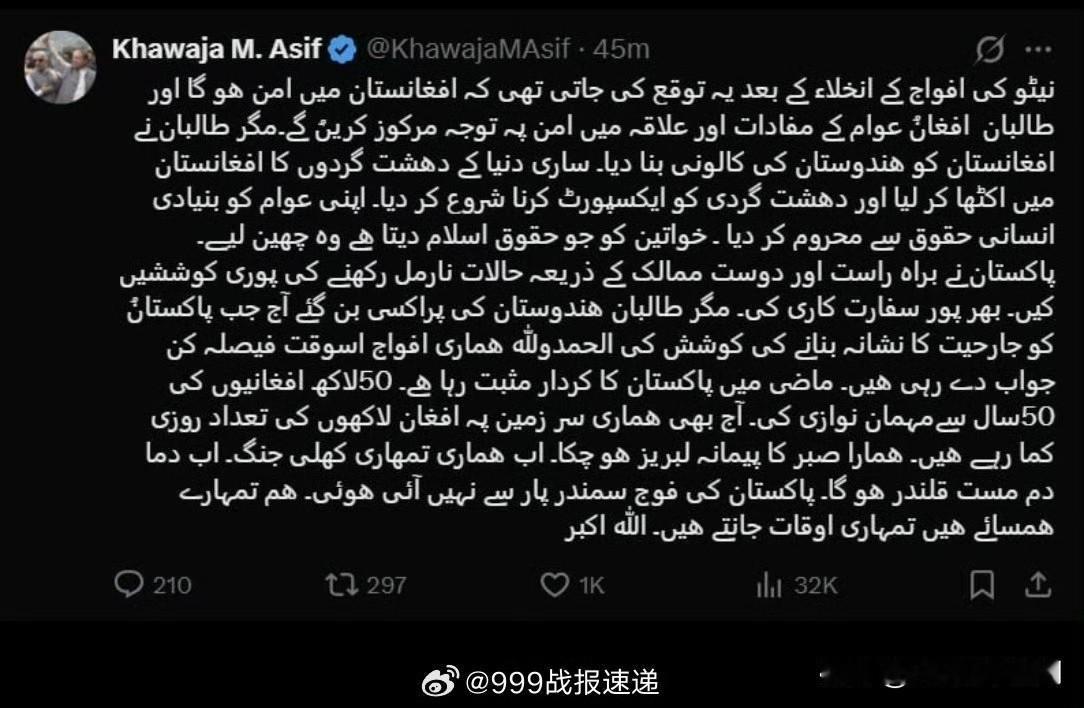 阿富汗防长点名印度! 2月27日,巴基斯坦防长阿西夫公开发文: “阿富汗塔利班政府将阿富汗变成了印度殖民地、成为印度的傀儡、并不惜代价为恐怖分子提供庇护。 巴基斯坦已忍无可忍,只能对阿富汗正式宣战!” 如此看来,打得不可开交之际,印度可能会大力军援阿富汗。