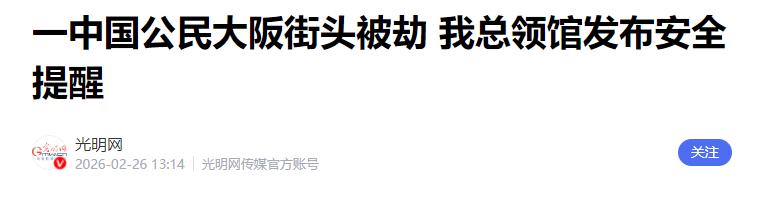 中国驻日领事馆再次发布声明。 2月26日,中国驻大阪总领事馆紧急通报 通报里说得明明白白,2月25日,一名中国公民在大阪市住吉区的街头,突然遭到了不明身份人员的袭击和殴打。 对方下手没轻没重,打完之后,还抢走了这名中国公民身上的背包,背包里装着500万日元现金,换算成人民币差不多25万左右,可不是小数目,对普通人来说,这可能是辛辛苦苦攒下来的积蓄、做生意的本钱,就这么被抢走了。 更让人揪心的是,直到现在,作案的嫌犯还没被抓到,依旧在逃,没人知道他是谁,也没人知道他下次还会对谁下手。 这真的不是孤立的一件事,最近这两年,日本的治安早就不是大家印象中那个样子了,类似的案件一直在频发,而且针对中国公民的暴力事件,也越来越多。 根据日本警察厅的统计,从2021年到2024年,日本涉嫌违法犯罪的案件一年比一年多,从56.8万件涨到了73.8万件,其中杀人、抢劫、强奸这些重罪,更是从8821件涨到了14614件,涨了差不多六成多。 到了2025年,情况更糟,无差别杀人案件比2023年激增了47%,暴力伤害案件也涨了4.5%,刑事案件数量创下了近几年的新高。更让人无奈的是,日本警方的破案率特别低,只徘徊在5%左右,大多数案件因为“证据不足”就草草结案,很多凶手就这么逍遥法外。 而且,针对我们中国公民的袭击和抢劫,也不是第一次发生了。2025年7月30号晚上,一名19岁的中国大学生在大阪旅游,和朋友从便利店回酒店的路上,被一名32岁的日本无业男子从背后勒住,殴打之后抢走了钱包和手机,受害者还受了伤。 虽然这名嫌犯后来被逮捕了,但他始终没说自己为什么要作案。除此之外,2025年前9个月,有记录的在日华人遇袭案件就超过了27起,平均下来差不多每周就有一起,有的是被无端辱骂,有的是被殴打,甚至还有人被持械攻击,这些受害者和袭击者素不相识,对方就是无缘无故下手。 这次中国公民在大阪被抢劫袭击后,中国驻大阪总领事馆没有丝毫拖延,第一时间就向日本当地警方提出了交涉,明确要求日方尽快破案,抓住嫌犯,严肃处理,同时还要切实保护好所有在日中国公民的生命财产安全。 不仅如此,领事馆还再次发出提醒,让近期打算去日本的中国公民,尽量避免前往;已经在日本的中国公民,要多关注当地的治安形势,提高安全意识,尽量不要携带大量现金出门,做好自我保护。 日本之所以治安越来越差,根本原因还是经济长期停滞,很多年轻人找不到工作,失业人数越来越多,2025年9月,日本的失业人数就达到了181万人,创了14个月的新高。这些找不到工作、生活窘迫的人,心里积累了很多不满,就容易通过暴力、抢劫这种极端方式发泄,有的甚至专门针对外国人下手。 中国驻日使领馆也不是第一次发布安全提醒了,之前就多次向日本外务省和警方交涉,要求他们加强街头巡逻,严惩凶手,改善治安环境,但日方的响应一直很迟缓,实际采取的改善措施也很有限,某种程度上,也纵容了犯罪的蔓延。 这次中国驻大阪总领馆的紧急通报和声明,不只是简单告知一件案件,更是在替所有在日中国公民撑腰,明确告诉日方:保护在日外国公民的安全,是你们的责任,要是做不到,我们绝不会坐视不管。 同时也在提醒每一位中国公民,不管是去日本旅游、务工,还是探亲,都不能再抱着“日本绝对安全”的想法,一定要提高警惕,保护好自己。 这件事虽然只是一起街头抢劫案,但它反映出的,是日本治安的持续恶化,也让我们看清,所谓的“安全神话”,其实不堪一击。 中国领事馆一次次发布提醒、一次次与日方交涉,目的只有一个,就是保护好每一位在日中国公民的安危。我们不惹事,但也绝不怕事,只要中国公民在海外遇到危险,祖国永远是最坚实的后盾,领事馆永远会第一时间站出来,为大家保驾护航。