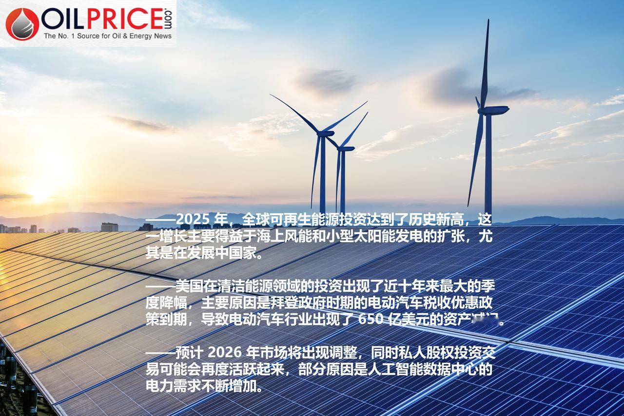尽管全球投资创下新高,但清洁能源市场仍将面临动荡的一年 对于清洁能源市场来说,今年可谓动荡不安。尽管重大政策调整影响了绿色产业,但 2025 年全球可再生能源投资却达到了历史新高。仔细查看去年的数据可以发现,市场中存在着强烈的矛盾情绪,美国在去年对清洁能源的投资大幅下降,但与此同时,在同一时间段内,清洁能源交易却出现了令人惊讶的复苏。 尤其是电动汽车行业,自特朗普政府在去年秋季终止了拜登政府时期的电动汽车税收优惠后,已经显现出了急剧收缩的迹象。在全球范围内,自 9 月份美国 7500 美元的联邦税收补贴被取消以来,电动汽车制造商已累计注销了 650 亿美元的资产,主要汽车制造商如福特和斯特兰蒂斯报告了巨额亏损,并取消了电动汽车项目。在美国,电动汽车销量的下降是该国近十年来清洁能源投资出现最大季度降幅的主要原因。 2025 年,美国清洁能源投资总体表现强劲,年度总额达到创纪录的 2770 亿美元。但第四季度的数据却令人沮丧。据报道,有 80 亿美元的清洁能源项目被取消,而新宣布的项目仅价值 30 亿美元。“这意味着新的投资渠道正在萎缩,” 荣鼎集团气候与能源部门的副主管汉娜·赫斯最近对无党派新闻机构Semafor表示。“通常情况下,即便出现季度波动,从宏观角度来看我们仍能看到持续的增长势头。但现在这种情况已不再成立。” 而且电动汽车投资和清洁能源投资的下滑趋势很可能会继续下去,因为特朗普政府正在加大其气候政策的撤销力度。本月早些时候,该政府实施了“美国历史上规模最大的放松监管举措”,它废除了 2009 年将二氧化碳列为对公众健康构成威胁的法律,从而削弱了监管机构设定排放上限的能力。 然而,彭博社报道称,在经历了充满极端政策不确定性的一年之后,清洁能源领域的私募股权交易出现了复苏的迹象。去年,清洁能源领域的收购交易大幅减少,同比降幅超过 50%。实际上,相关数据已降至 2013 年的水平,这相当于抹去了过去十年的全部增长成果。 但有几条原因可以表明我们有望在 2026 年看到市场出现调整。据彭博社报道:“人工智能数据中心的电力需求持续推动了可再生能源的投资,预计到 2035 年,美国数据中心的用电量将比 2024 年增长两倍。”“与此同时,去年的经济放缓迫使开发商和资产所有者重新评估估值。”尽管交易活动有所增加,但该行业仍有很长的路要走才能恢复元气。 在发展中国家,清洁能源的推广和电动汽车的普及呈现出迅猛的增长态势。由于其成本已变得可承受且易于获取,小型太阳能系统在资源匮乏的国家(如巴基斯坦以及撒哈拉以南非洲的大部分地区)得到了蓬勃发展。 “拥有良好收益机制的市场在可再生能源投资方面一直保持着强劲势头,”彭博新能源财经清洁电力部门负责人梅雷迪思·安克森说道。“而在那些收益稳定性不断变化的市场中,尤其是当政策出现大幅波动时(比如在美国或中国大陆),相关项目则会先经历一轮繁荣与萧条的交替周期,然后再迎来政策变化。”