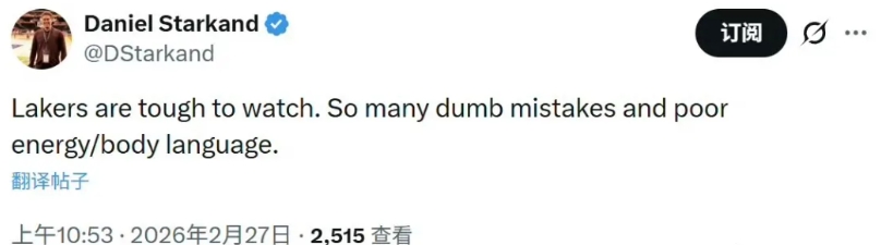 湖人队的糟糕表现连队内记者都看不下去了,跟队记者Daniel发文写道:湖人队的比赛真让人看不下去,太多的愚蠢失误,拼劲和肢体语言都很糟糕。连自己人都无奈至极,足以证明这支球队有多么让人失望。