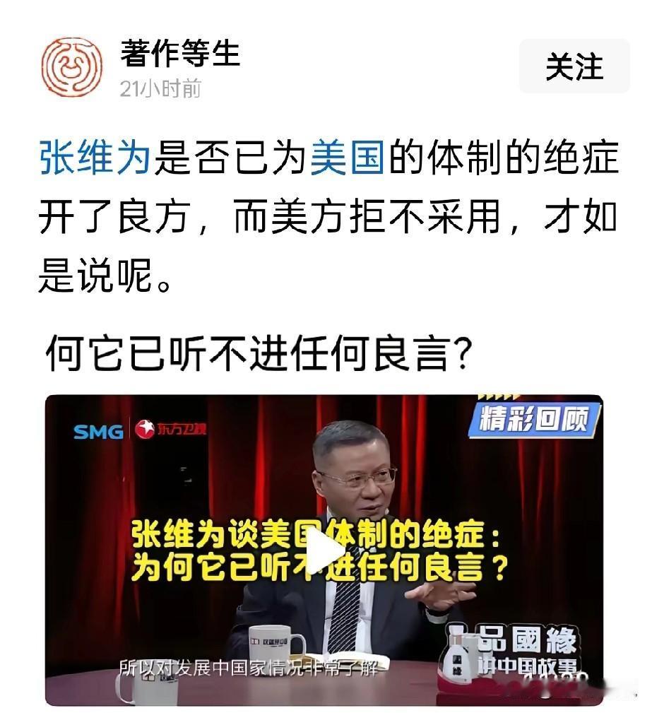 不得不说张维为专家已经看透了美国的恶疾,而且给出了陷入绝症的诊断 虽然确诊了美国的恶疾,但是张维为专家绝对不会开药方 他要眼睁睁的看着美国一步步衰弱下去,直到死亡 对于张维为这样的专家,绝对要好好保护起来,绝对不能让美国挖过去给自己开药方 而是要让张维为专家给自己开良方,长命百岁,笑看美国衰落