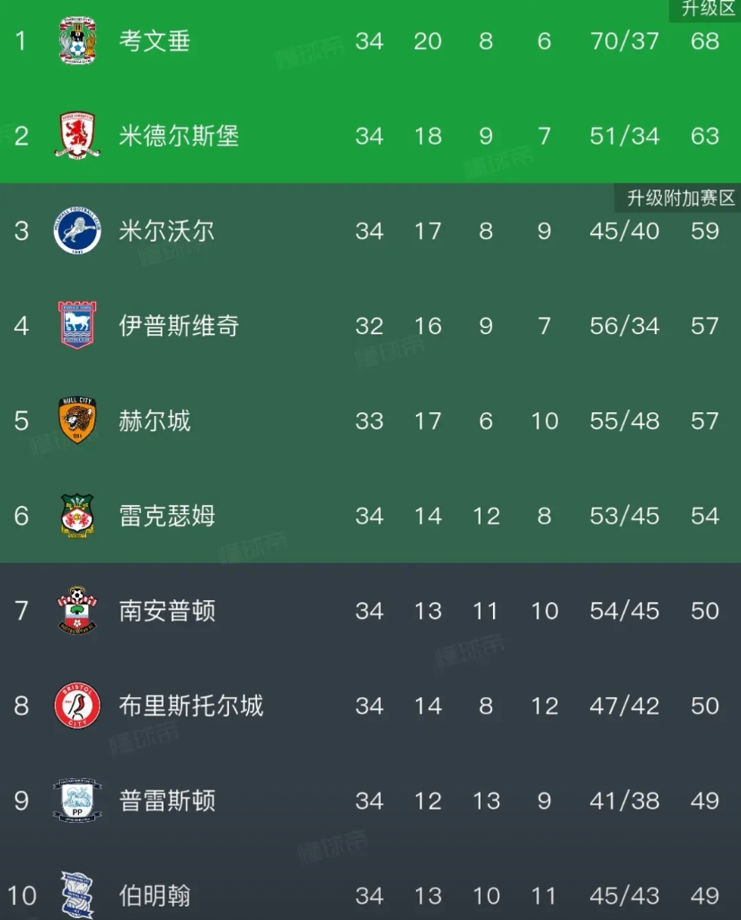 英冠打到34轮,半程王者考文垂重新夺回榜首,三连胜手握5分优势,米堡大势已去,不谈争冠,能否守住第二也要看他人脸色!