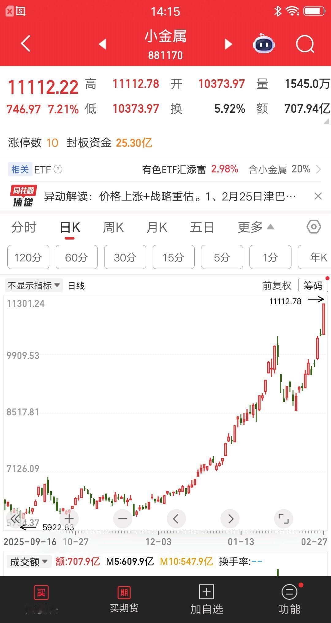 小金属板块涨的真好呀,开盘主力就猛拉,而且是持续猛拉,股价高位运行,大涨7.21%。日线看,这波主升浪涨了26%,持股不动的散户赚大了,真让人羡慕嫉妒恨呀。 个股清一色涨停,翔鹭钨业,章源钨业,宝武镁业极速封板。不得不说,主力太有实力了,以绝对的力量压住空头。 大主力最看重逻辑,行业的底层逻辑有没有变,就拿小金属来说,别以为只是单纯的炒作,而是战略价值的系统性重估。 不仅是咱们,全球的战略性资产都在涨,这是大国竞争的必然结果。 炒股要想赚大钱,审美是第一要义。如果方向都选不对,只能说明还没入门。主力看图形吗,主力会感受情绪吗,我想主力是不会考虑这些的,想得太多反而做不好。 当然高位票的风险很大了,一定要警惕起来。