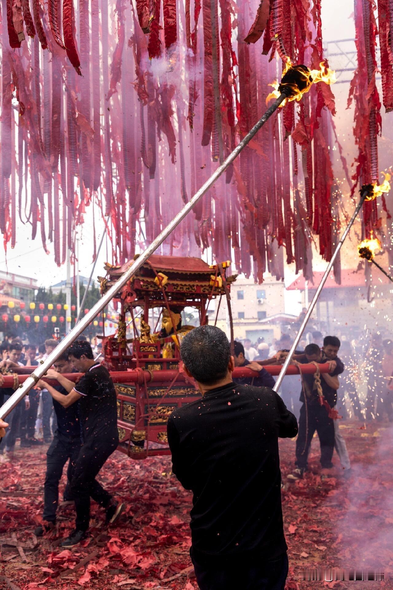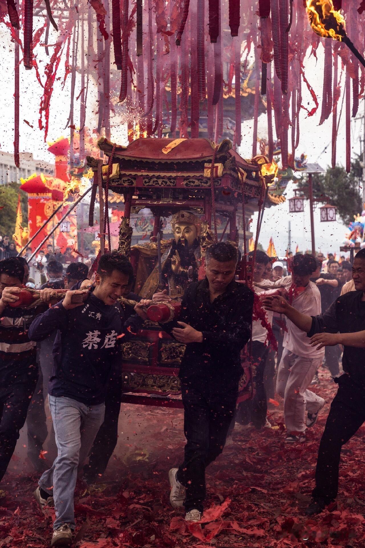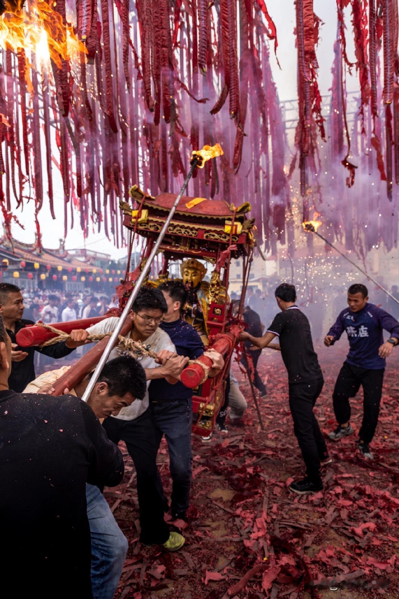炸到耳聋,看到心碎💔或许禁炮就将绝版了🔥 据说二月初三还有……… 正月初十的角美蔡店,没有温柔的烟火,只有震彻天地的轰鸣。这藏了数百年的非遗绕炮阵,是闽南人刻在骨血里的热闹与倔强,一眼震撼,一生难忘。 高高的木架上,千万串鞭炮垂挂如赤色瀑布,密密麻麻坠满头顶,风一吹,红穗轻晃,像一场即将到来的盛大狂欢。火把一点,引线嘶嘶燃着,下一秒,万炮齐鸣,硝烟瞬间吞没街巷,空气里全是滚烫的硫磺味、烟火气,混着尘土与汗水,是最地道的人间年味。 壮汉们扛着神像,在炮火里奔跑。鞭炮在耳边炸响,嗡嗡作响,几乎听不见人声;火星溅在身上,红纸屑漫天飞落,落满头发、肩膀、衣衫,脚下是厚厚一层红屑,踩上去松软又滚烫。 人潮里总有人脚步踉跄,被硝烟迷眼、被冲击力撞得跌倒。鞭炮还在炸响,没有人退缩,咬着牙爬起来,抹一把脸,扛稳神像继续往前冲。只有一往无前的韧劲。这一刻才懂,爱拼才会赢从不是一句口号,是炸在炮火里、跌在尘土里,依然站起来往前跑的勇气,是闽南人最鲜活的模样。 锣鼓声混着炮响,人声裹着硝烟,老人们站在巷口守望,孩子们捂着耳朵又舍不得挪开眼,在外的乡人赶回来,只为赴这一场百年之约。炮声越响,祈愿越诚,求风调雨顺、国泰民安,求家人平安、岁岁安康,所有心意都藏在这漫天炮火与奔跑的身影里。 可热闹背后,总藏着说不清的心酸。耳边总听见人说,或许明年,就没有了。禁炮的风声越来越紧,这样野蛮、滚烫、热血的绕炮阵,或许就要停在这个春天。 它不是迷信,是代代相传的民俗,是村落的凝聚力,是我们从小到大最盼的年味。以后再也听不到震耳的炮响,再也看不见漫天红屑,再也看不到跌倒又爬起的身影,这份独属于闽南的震撼与烟火气,只能留在记忆里。 耳朵还在嗡嗡作响,硝烟慢慢散去,地上的红毯厚厚一层。我拼命记住这一刻,记住这震彻心扉的热闹,记住这滚烫的人间烟火。