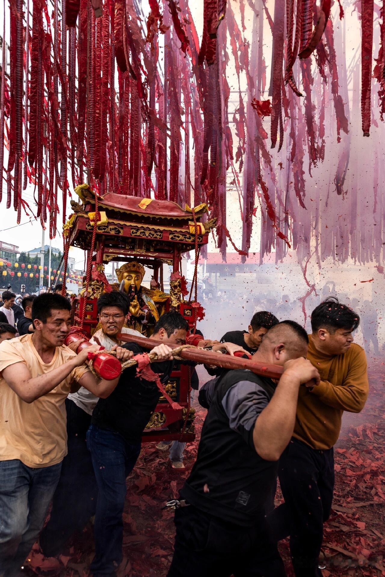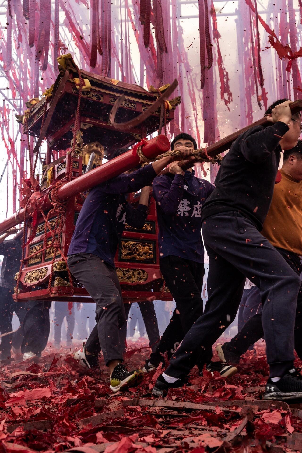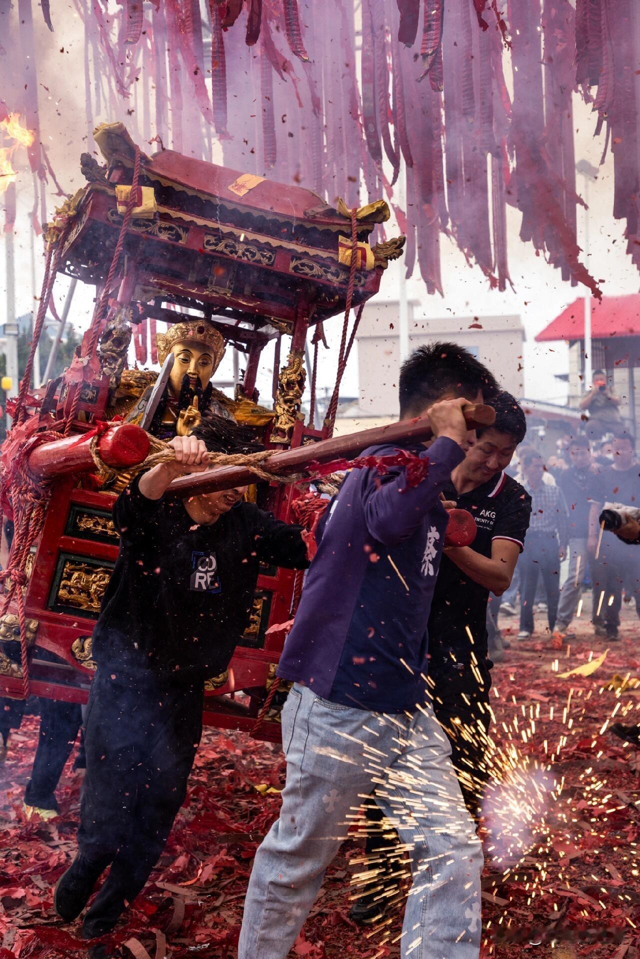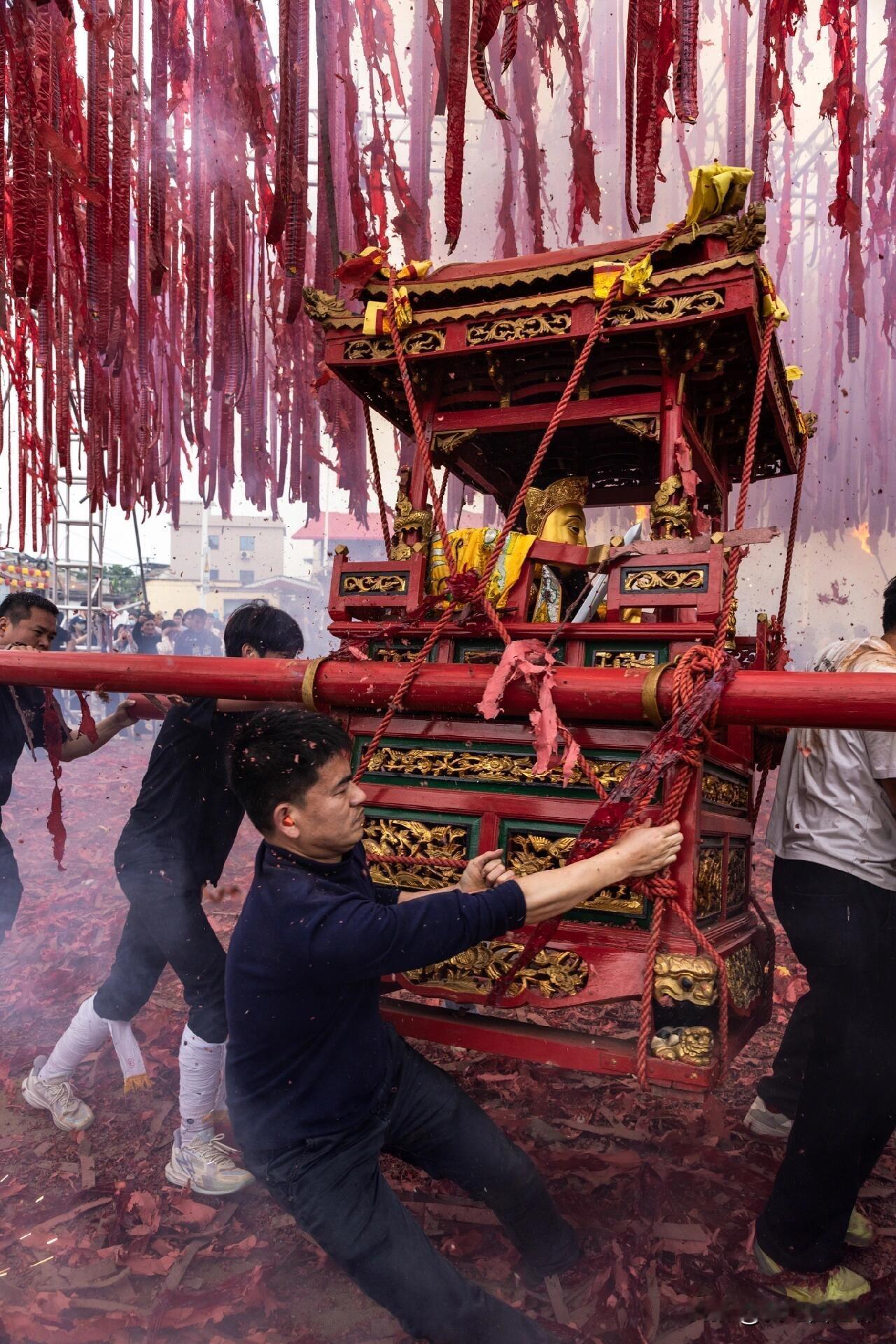 炸到耳聋,看到心碎💔或许禁炮就将绝版了🔥 据说二月初三还有……… 正月初十的角美蔡店,没有温柔的烟火,只有震彻天地的轰鸣。这藏了数百年的非遗绕炮阵,是闽南人刻在骨血里的热闹与倔强,一眼震撼,一生难忘。 高高的木架上,千万串鞭炮垂挂如赤色瀑布,密密麻麻坠满头顶,风一吹,红穗轻晃,像一场即将到来的盛大狂欢。火把一点,引线嘶嘶燃着,下一秒,万炮齐鸣,硝烟瞬间吞没街巷,空气里全是滚烫的硫磺味、烟火气,混着尘土与汗水,是最地道的人间年味。 壮汉们扛着神像,在炮火里奔跑。鞭炮在耳边炸响,嗡嗡作响,几乎听不见人声;火星溅在身上,红纸屑漫天飞落,落满头发、肩膀、衣衫,脚下是厚厚一层红屑,踩上去松软又滚烫。 人潮里总有人脚步踉跄,被硝烟迷眼、被冲击力撞得跌倒。鞭炮还在炸响,没有人退缩,咬着牙爬起来,抹一把脸,扛稳神像继续往前冲。只有一往无前的韧劲。这一刻才懂,爱拼才会赢从不是一句口号,是炸在炮火里、跌在尘土里,依然站起来往前跑的勇气,是闽南人最鲜活的模样。 锣鼓声混着炮响,人声裹着硝烟,老人们站在巷口守望,孩子们捂着耳朵又舍不得挪开眼,在外的乡人赶回来,只为赴这一场百年之约。炮声越响,祈愿越诚,求风调雨顺、国泰民安,求家人平安、岁岁安康,所有心意都藏在这漫天炮火与奔跑的身影里。 可热闹背后,总藏着说不清的心酸。耳边总听见人说,或许明年,就没有了。禁炮的风声越来越紧,这样野蛮、滚烫、热血的绕炮阵,或许就要停在这个春天。 它不是迷信,是代代相传的民俗,是村落的凝聚力,是我们从小到大最盼的年味。以后再也听不到震耳的炮响,再也看不见漫天红屑,再也看不到跌倒又爬起的身影,这份独属于闽南的震撼与烟火气,只能留在记忆里。 耳朵还在嗡嗡作响,硝烟慢慢散去,地上的红毯厚厚一层。我拼命记住这一刻,记住这震彻心扉的热闹,记住这滚烫的人间烟火。
