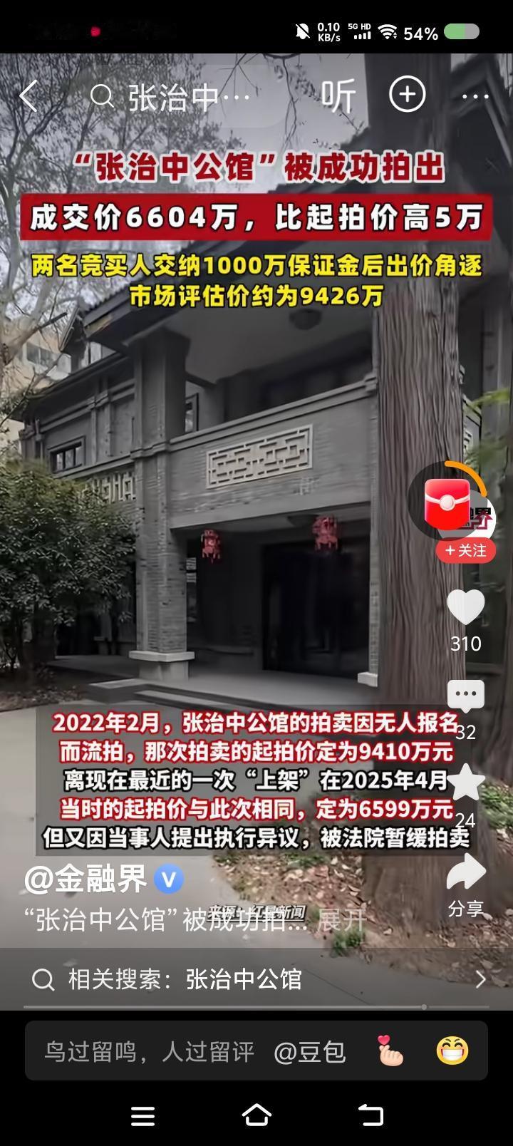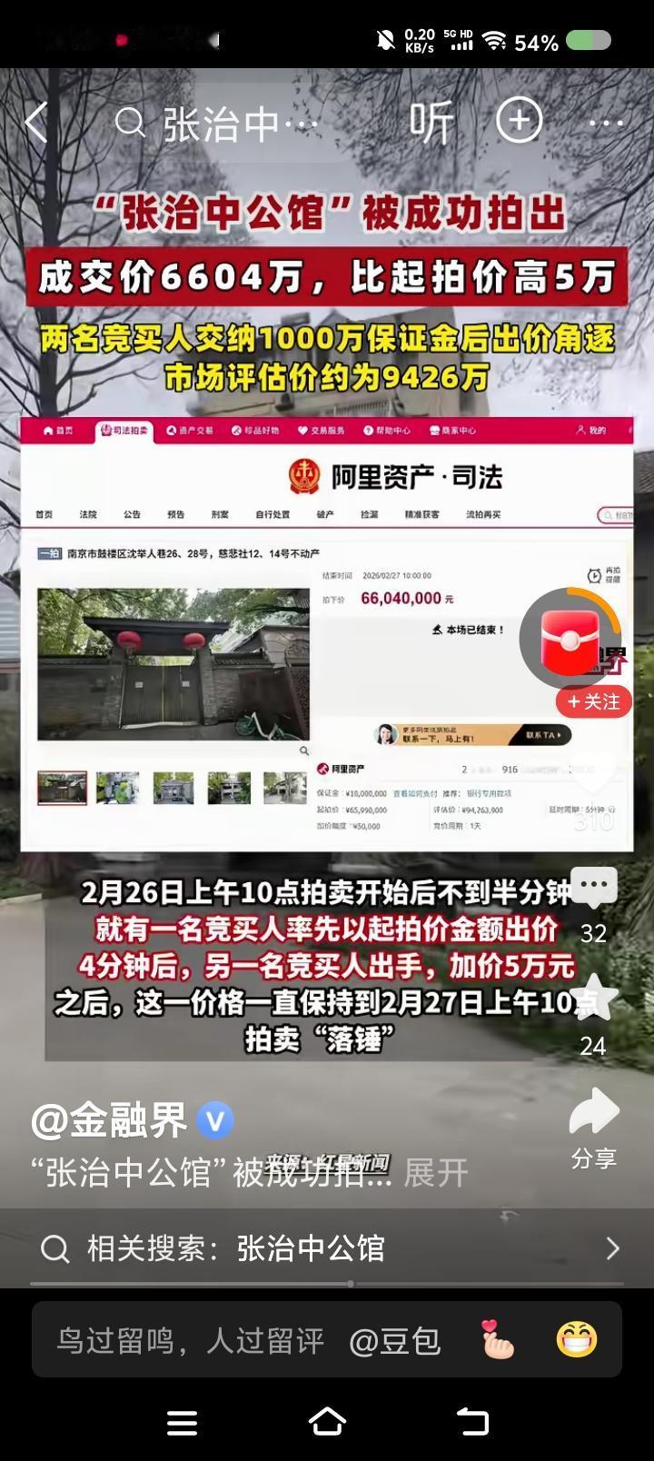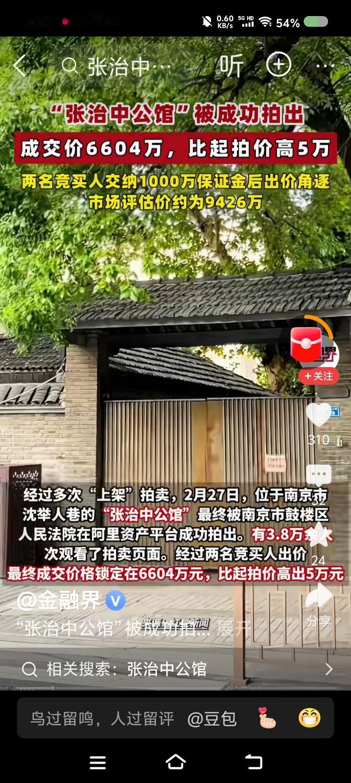 这能这样拍卖?—— 据报道,张治中公馆被成功拍卖。起拍价6599万。评估价9426.39万元。成交价6604万元。此次,竞拍价保留将近一天,成功。 点评: 一、保留这么长时间? 二、两人竞拍才差5万? 三、买到就是赚到?