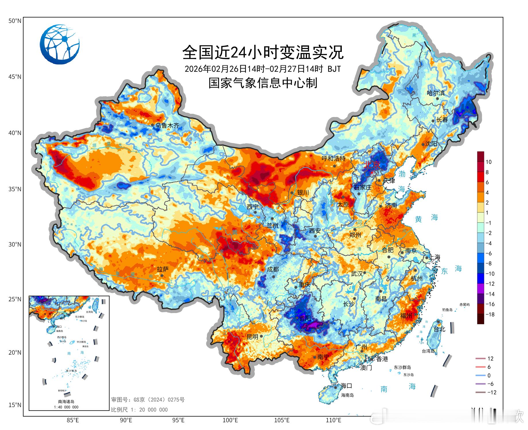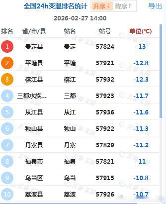 【气温波动】今天气温的起伏,主要还是和阴晴变化有关。贵州因为云量增多,叠加冷空气南下,包揽了14时降温榜前十:贵定降13℃、平塘降12.8℃、榕江降12.3℃,排名前三。而昨天榕江还是升温榜的榜首。此外华北、东北部分地区降温也比较明显。黑龙江东宁降10℃、河北滦平降9.9℃、北京密云上甸子降9.8℃。