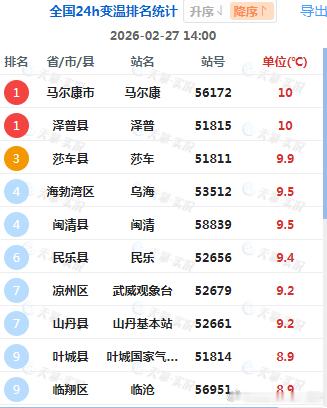 今天在新疆西南部、甘肃西部、内蒙古西部、四川西北部、福建东部、云南西南部、升温明显。四川马尔康升10℃、新疆泽普升10℃、内蒙古乌海升9.5℃、福建闽清升9.5℃、甘肃民乐升9.4℃、云南临沧升8.9℃,为各自省区14时升温最强的站点。