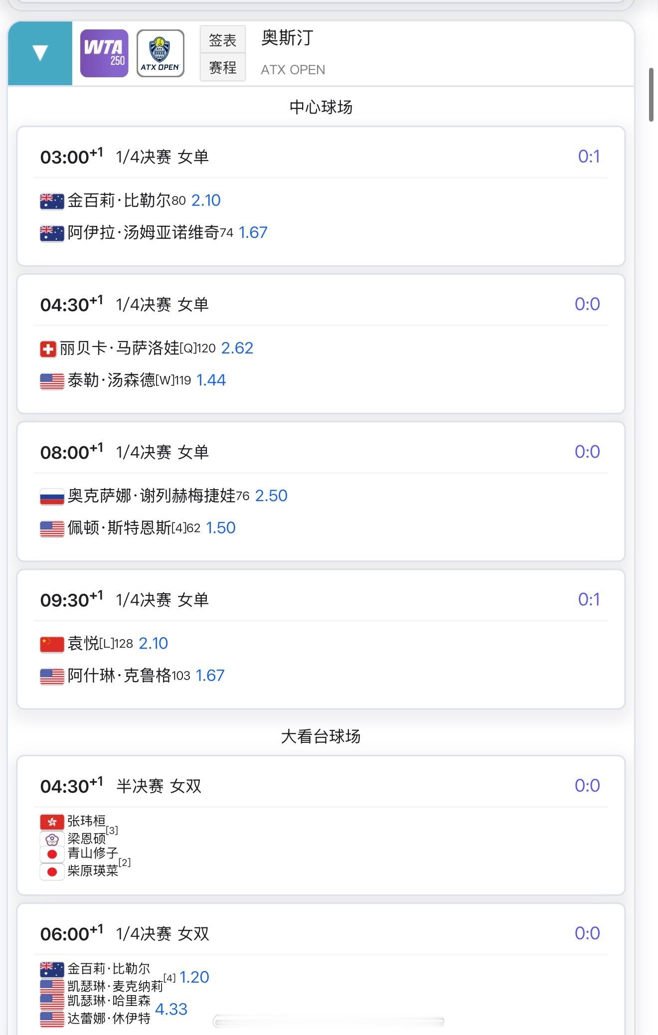 +8:00张帅vs卡辛采娃+10:00袁悦vs克鲁格