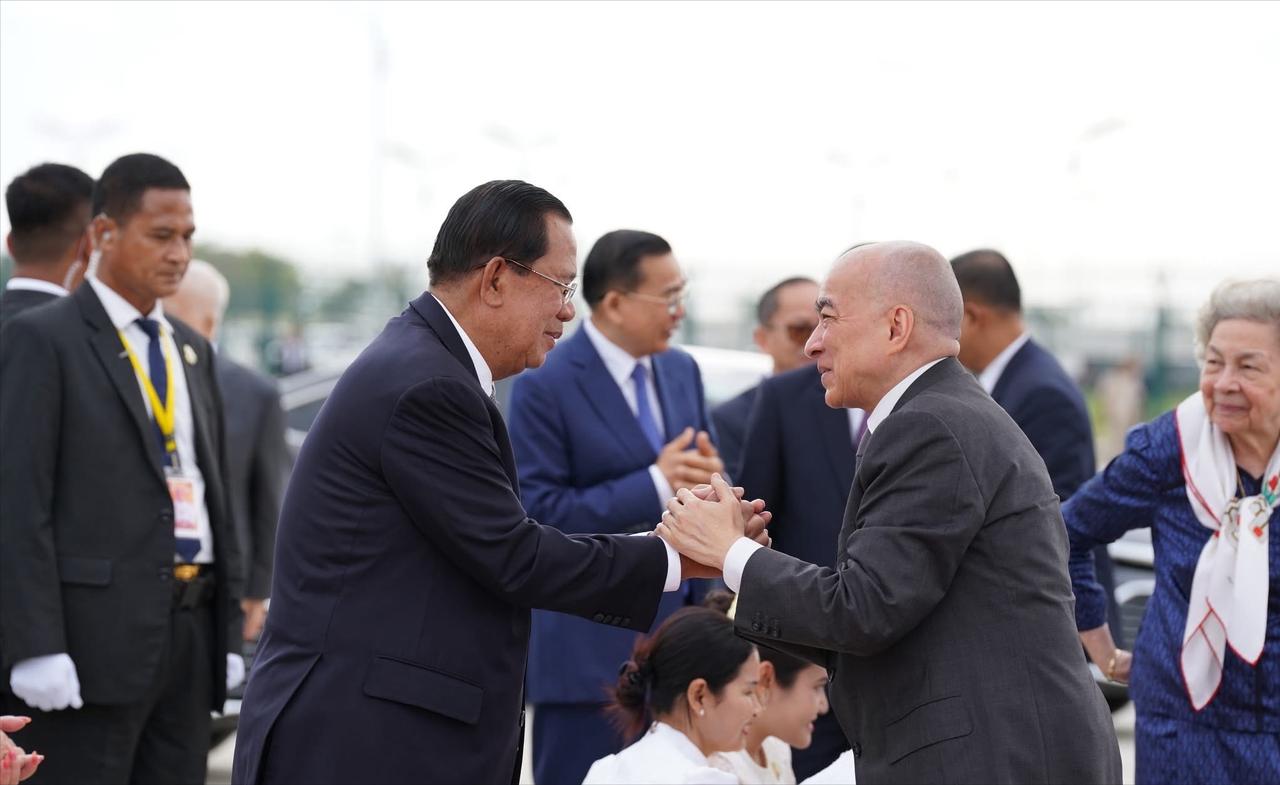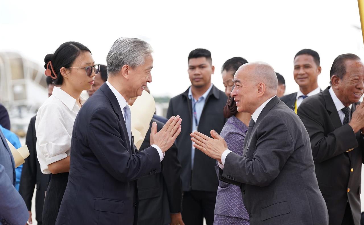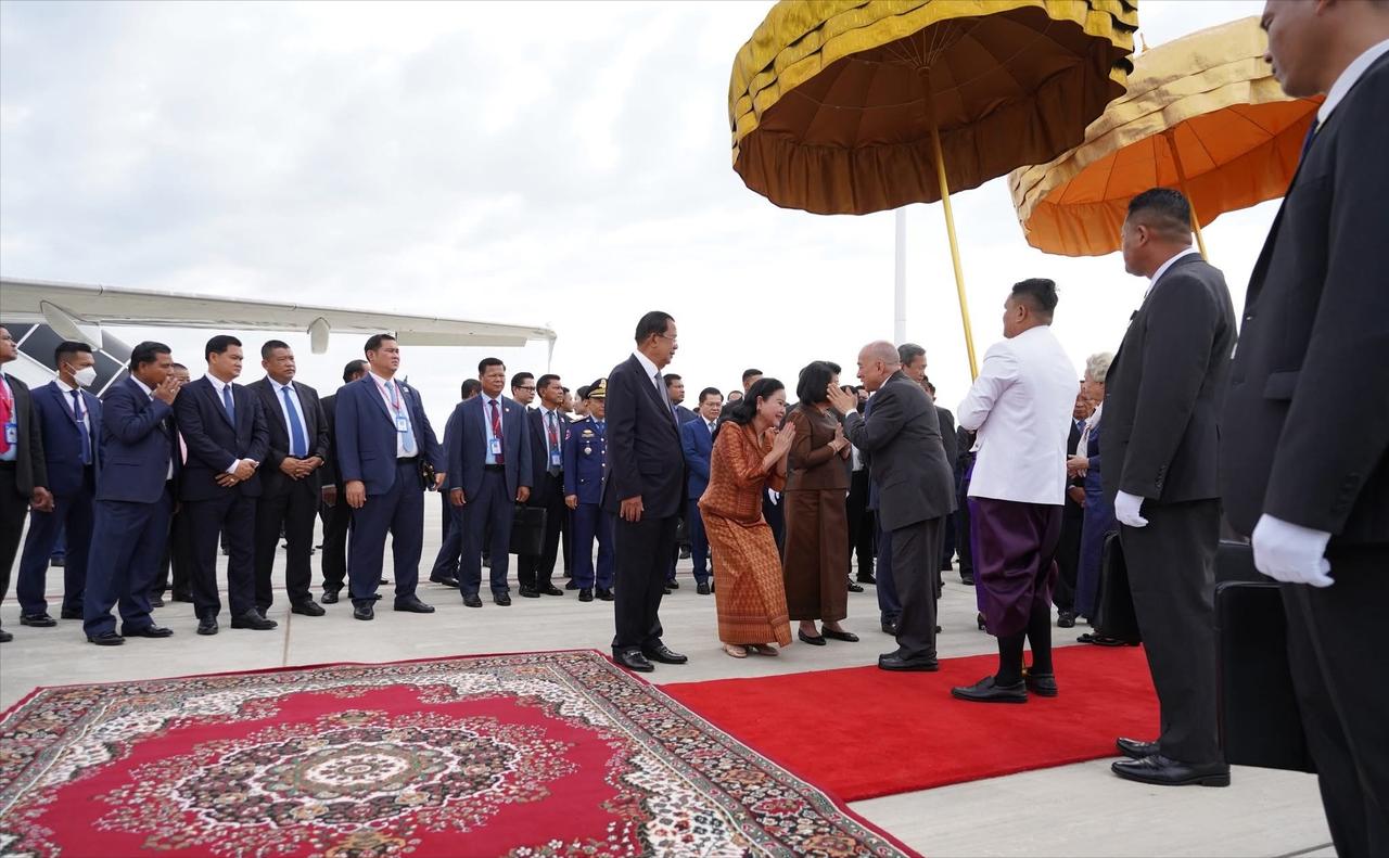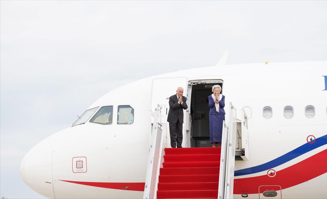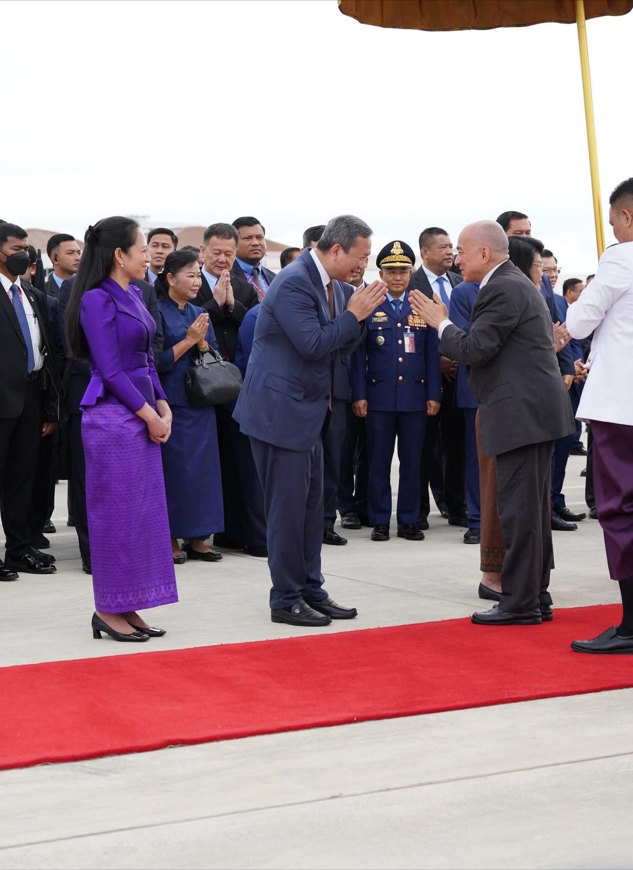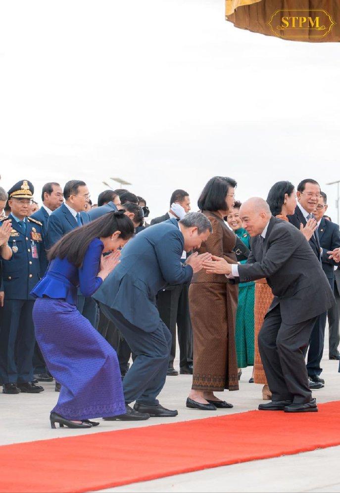 2月27日,柬埔寨国王西哈莫尼与莫尼列王太后乘专机启程前往北京进行例行体检! 每年,莫尼列太后都会在北京居住很长的一段时间,而西哈莫尼国王也会陪伴在母亲身边,可以说北京俨然已经成为了国王和太后的第二故乡了。 西哈莫尼国王和莫尼列太后在马年春节刚过,就立马乘专机来北京,也是进行例行的体检,母子俩每年都要多次往返北京和柬埔寨。 但是每一次国王和太后启程来北京,或者返回柬埔寨,柬埔寨机场都会举行隆重的仪式,洪森夫妇、总理洪玛奈夫妇等都会亲自到机场,仪式感满满。 莫尼列太后一身藏蓝色柬埔寨传统服饰,披着小清新丝巾,即便满头白发,89岁的老太太依旧精致优雅。 柬埔寨第一夫人碧占莫妮和婆婆文拉妮选择的是更为亮丽的金咖色和紫色,屈膝礼时也是相当到位,西哈莫尼国王双手合十回应,也是相当礼貌。