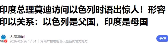 印度的莫迪简直是疯了,他在访问以色列期间所留下的这句金句,注定要载入外交史册 当地时间2月25号,莫迪抵达以色列,开启了为期两天的访问,这是他2014年当上印度总理以来,第二次访问以色列,也是2023年巴以冲突爆发后,他第一次去中东。 本来,国家领导人互访,说些友好合作的话很正常,就算关系再好,也得有外交分寸,可莫迪偏不,在以色列议会的公开演讲里,直接语出惊人,把两个主权国家的关系,说成了“父国”和“母国”,这话一出口,不光国际社会炸了锅,印度国内也吵翻了天。 在外交场合最讲究平等和尊重,任何一个主权国家,都是独立平等的,从来没有什么“父国”“母国”的说法,这不是简单的口误,而是彻底乱了规矩,把国家间的合作关系,硬生生说成了类似家庭亲属的关系,显得特别不严肃,也特别没分寸。 而且,就在莫迪访以之前,还有19个国家联合发表声明,谴责以色列违反国际法、扩建定居点的行为,可莫迪偏偏在这个风口浪尖,高调力挺以色列,甚至说出这种出格的话,明摆着就是逆势而为,不顾国际共识。 莫迪之所以敢这么说,不是脑子一热,背后全是算计,可就算是算计,也不该疯到这种地步,连基本的外交底线都丢了。 首先,最核心的就是军贸合作,印度现在是以色列最大的军火买家,2020年到2024年这几年,印度买的军火,占了以色列军火出口总额的34%,实打实的头号客户。 印度军队里的很多装备,比如“苍鹭”无人机、防空导弹系统,都是从以色列买的,这次访以,莫迪还和以色列谈好了,要联合生产“铁束”激光防御系统,就是想让以色列转让技术,帮印度搞“印度制造”,所以他才故意说这种讨好以色列的话,好换取更多的技术和装备支持。 其次,就是为了自己的政治利益。莫迪的执政根基是印度教民族主义,而以色列也是以犹太民族为核心建立的国家,两者在民族、宗教认同上有契合点。 莫迪公开力挺以色列,甚至说出“父国母国”的话,就是想在印度国内塑造自己“强硬领袖”的形象,凝聚国内右翼选民的支持,为自己长期执政铺路。毕竟,他上台这么多年,一直靠着强化印度教身份认同来拉选票,这次讨好以色列,也是国内政治的延伸。 还有就是地缘战略的算计。印度一直想搞“印度—中东—欧洲经济走廊”,而以色列是这条走廊的关键节点,和以色列搞好关系,能帮印度打通这条贸易通道,扩大在中东的影响力。 另外,土耳其最近加强了对巴基斯坦的军事支持,这让印度很不安,所以他想通过深化和以色列的合作,对冲这种压力,甚至想加入以色列计划组建的“六边形联盟”,提升自己在中东的话语权。 可莫迪没想到,他这句疯魔的话,带来的全是麻烦。先看国际上,卡塔尔半岛电视台直接批评他,说他这是在透支印度的国际道义;印度的学者也直言,这种做法让印度丧失了在发展中国家的道德影响力,毕竟印度一直想当“全球南方领袖”,可这次却公然无视巴勒斯坦的权益,背弃了自己多年来的立场。 要知道,印度1992年才和以色列建交,在这之前,印度一直坚定支持巴勒斯坦建国,就算建交后,历届政府也都在以色列和阿拉伯国家之间保持平衡,可莫迪这次,直接彻底倒向以色列,全程没提巴勒斯坦,没提加沙的人道危机,甚至连“两国方案”都回避了,这种一边倒的态度,在印度外交史上极为罕见。 国内的反对声也不小,印度国大党直接谴责莫迪,说他彻底背弃了巴勒斯坦事业,为了短期利益,放弃了印度坚守几十年的道义立场。 还有很多印度民众表示,莫迪的这句话,让印度丢尽了脸面,一个主权国家,怎么能给自己找个“父国”,这简直是不可理喻。 其实大家都清楚,莫迪不是真的疯了,他只是太急于求成,想通过讨好以色列,换取军贸、技术和地缘上的利益,同时巩固自己的政治地位。 可他忘了,外交不是一厢情愿的讨好,更不能丢掉基本的底线和分寸。“父国母国”的说法,看似拉近了印以关系,实则让印度陷入了外交被动,得罪了阿拉伯国家,透支了自己的国际公信力,也打破了自己苦心经营的中东平衡外交。 这次莫迪访以,虽然和以色列签署了16项合作协议,涉及人工智能、农业技术等多个领域,也把两国关系提升为“特殊战略伙伴关系”,看似赚了便宜,但从长远来看,损失更大。 莫迪的这句“金句”,确实会载入外交史册,但不是作为成功案例,而是作为外交失当的典型。一个大国总理,在国际场合说出如此不合时宜、没有分寸的话,不仅丢了自己国家的脸面,也暴露了他急功近利的政治野心。