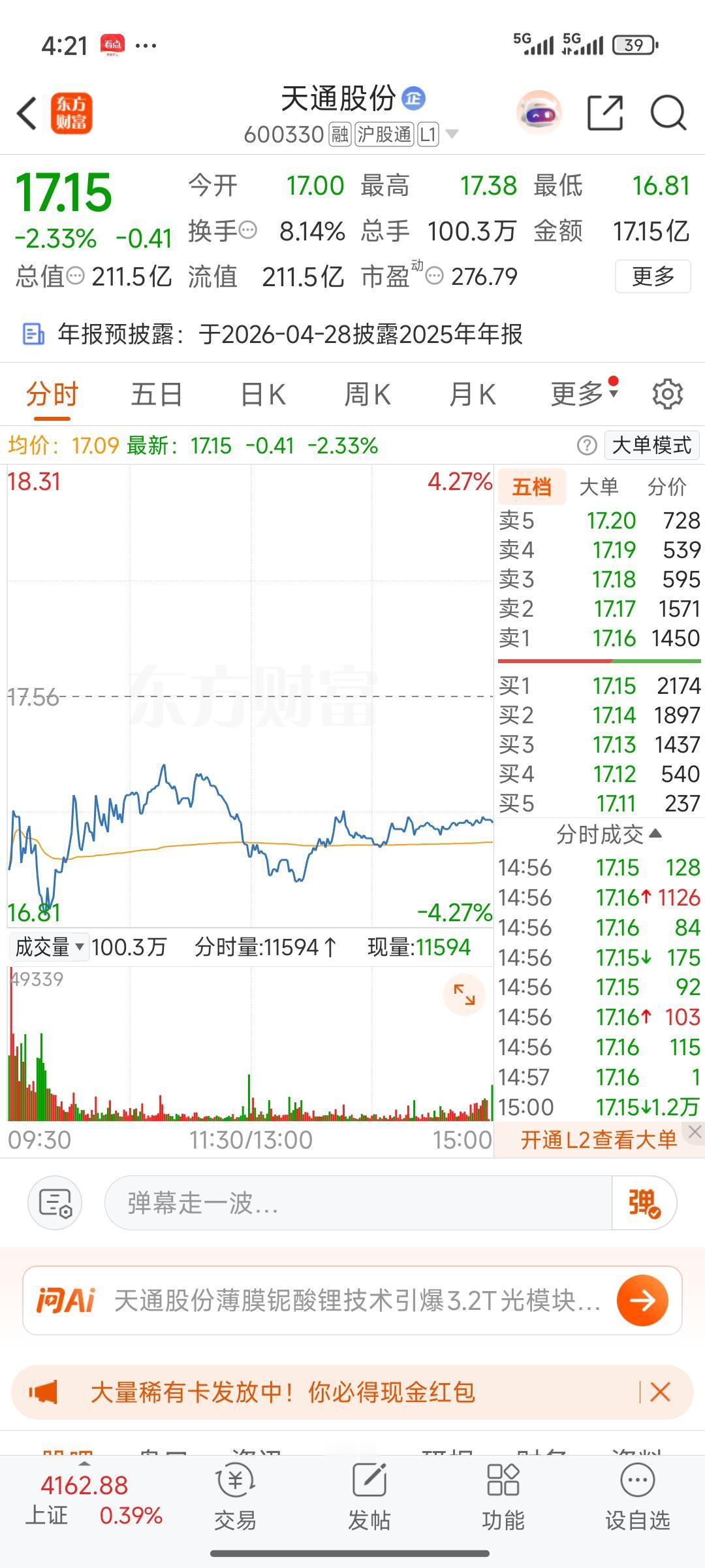 收盘了,天通股份今日低开低走,全天都在10天均线内调整,目前已有效跌破5日均线。原本按预期,我打算在股价低于5天均线,也就是跌破5天均线时就割肉。由于近期的研究让我对天通股份似乎又多了些信心,所以我把止损均线调整为10天和20天均线。若股价连续三天跌破10天均线,那我只能忍痛割爱,暂时与它告别,等三月四月后股价回调到12元左右时再入场。 归根结底,买这只股票是因为追在涨停最高位,没有有效把握时机,导致成本价过高。虽然天通股份成功形成突破性的箱体四渡赤水形态,但我自己却仍微亏。所以,选好股票,把握好买点十分重要。下次一定要从这次经历中吸取教训。 地天板股票 天普股份龙虎榜 航空天板块 天孚通 天通卫星通讯 天普股份 天通通信