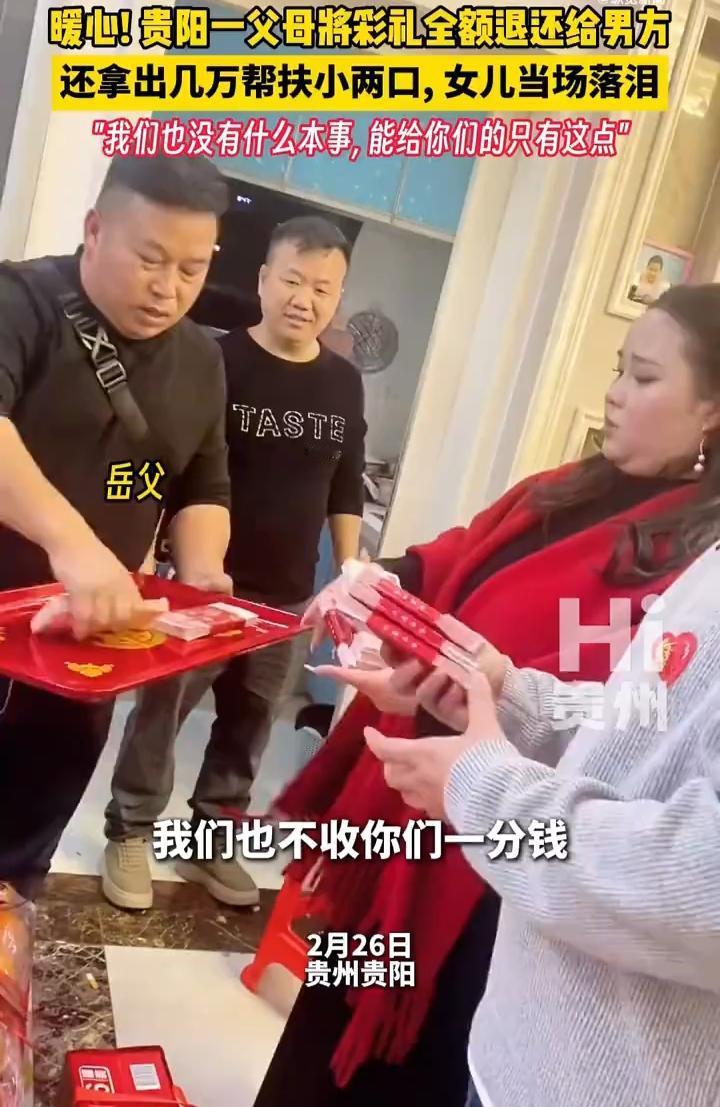 看哭了!贵州贵阳一名女子出嫁,新郎来接新娘的时候,岳父直接把之前收的所有彩礼都还给了新郎。 岳父说,“我们也不收你们一分钱,这些钱你们小两口自己拿着生活。” 新郎感动不已,但岳父接下来的举动,更是让他震惊。 只见岳父从随身背着的挎包里,又拿出几万块钱,递给了新娘,并说道,“我们也没什么本事,能给你们的只有这点,剩下的靠你们年轻人自己打拼。” 新娘接过钱,眼泪忍不住流下来。 网友看完这段视频,都觉得这位岳父的做法,真的体现出一个父亲的格局,同时也展现出对子女的关爱。 其实我一直觉得,结婚是两个年轻人自己的选择,而他们背后的父母,就是能在他们组成新家庭的时候,给予他们最好的帮助和祝福。 这位岳父做到了这点,他不仅把彩礼还给你女婿,也给女儿准备了嫁妆,可见他是真的心疼两个孩子。 身为父亲,他知道自己是在送女儿出嫁,而不是让别人用彩礼“买断”女儿,他更希望女儿幸福,而不是为了一点彩礼,让女儿出嫁后的生活,变得更加地困难。 他虽然挣钱不多,但也给了一个父亲能够付出的所有,相信他的女儿也感受到了他的真情,所以才会感动哭了,真的希望两个年轻人,以后要好好孝顺这位父亲。大家怎么看呢?