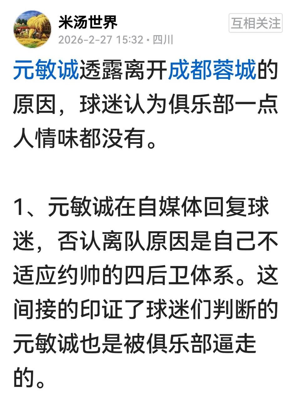 都说成都蓉城今年中超“赢在起跑线”,但看了蓉迷“米汤体育”为蓉城重建的总结,激荡的春心顿生寒意。 这网友说,因为在徐正源离开时,元敏诚把自媒体头像换成了全黑,这位上赛季主力瞬间就没了在亚冠和热身赛出场的机会。而元敏诚在与球迷互动中否认不适合四后卫体系,发告别感言全是不舍,就说明了一切。 按其梳理:去年末徐正源离开蓉城,直接表达过惜别之意的人都挺难熬的:助教甘锐悄然销声匿迹,周队毅然难下深圳,元敏诚突然被逼出走,留队的罗慕洛、费利佩战术地位大变,甘超轮换地位正失去,蹇韬太子之位被废……核心的意思就两个字:清洗。 如果球队谁上场谁离队真是俱乐部直接安排,那阿洛伊西就是一个傀儡。蓉城俱乐部某些人把对“功勋教练”的临别感言上纲上线,以此对球员做选择,真是没格局。但愿,“清洗”一说只是阴差阳错而非故意。